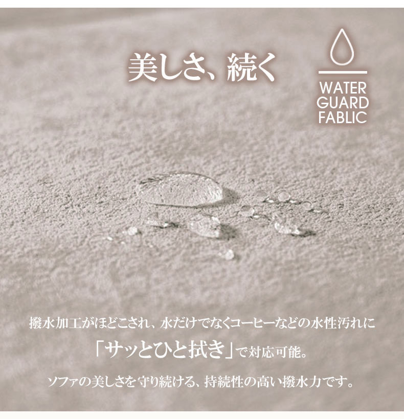 ソファの美しさを守り続ける、持続性の高い撥水力です。