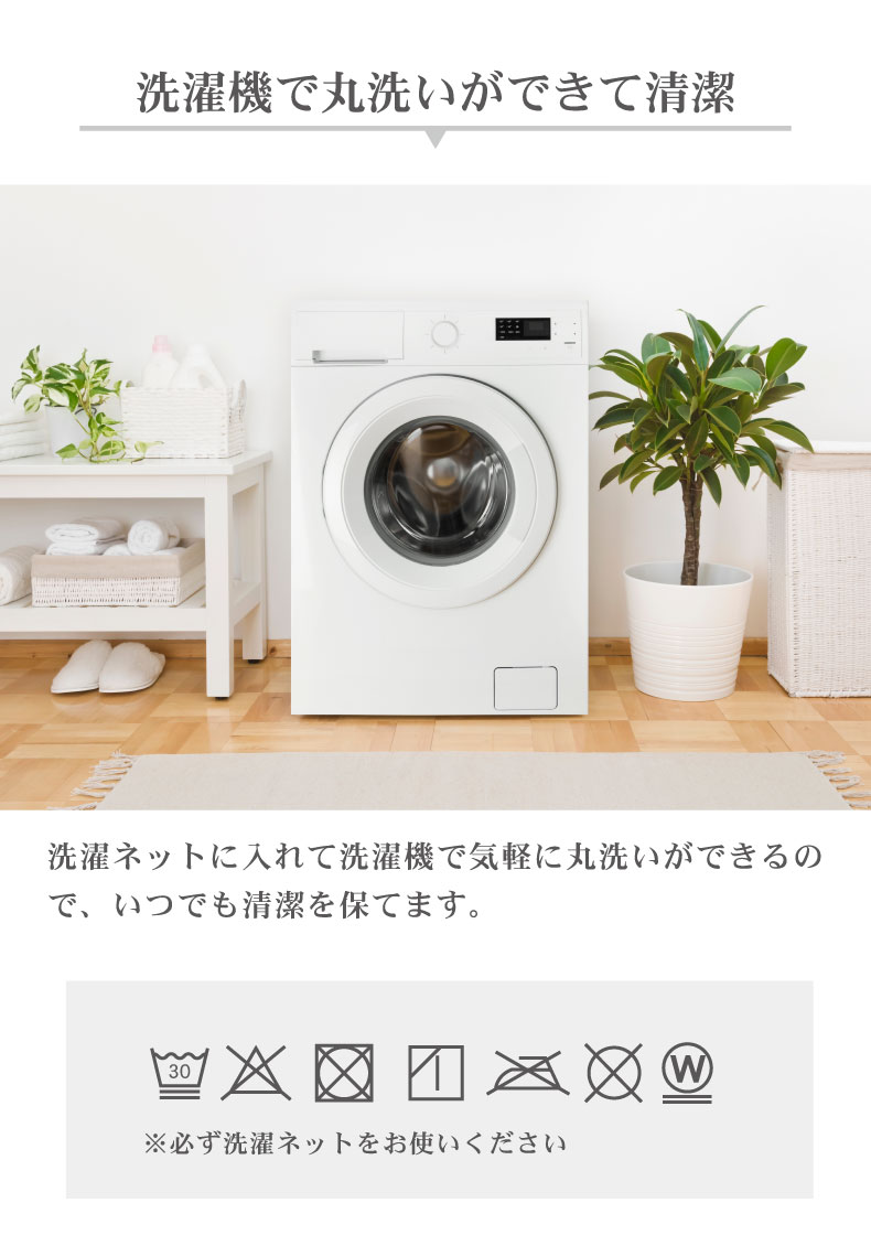 洗濯ネットに入れて洗濯機で気軽に丸洗いができるので、
