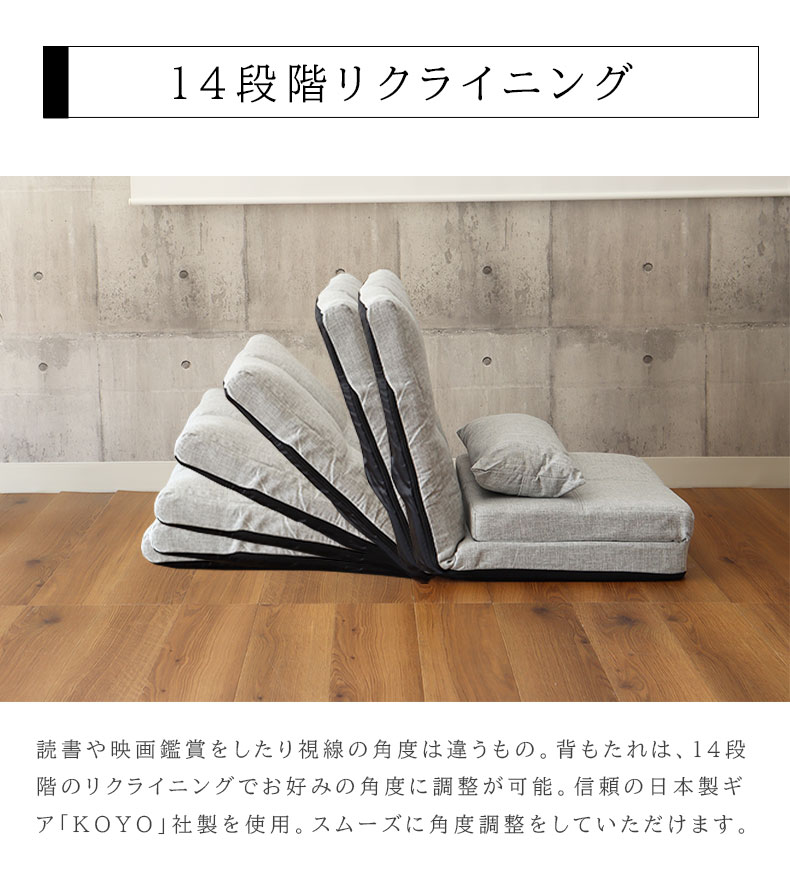 背もたれは、 14段階のリクライニングでお好みの角度に調整が可能。