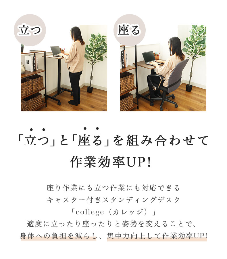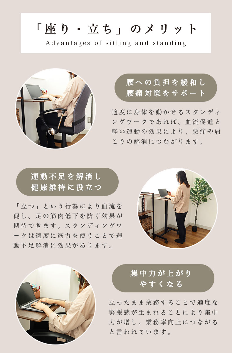 座りっぱなしの状態は体への負担を掛けます。 立ち作業を取り入れることで身体への負担の軽減と集中力向上に繋がります。