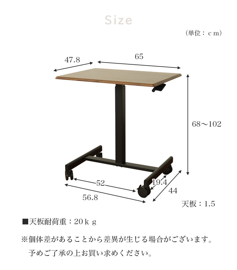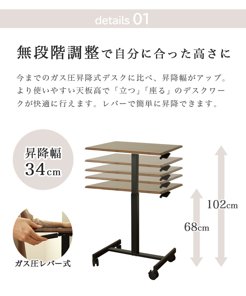 調整範囲は34cm。一般的なデスクの高さ68cmからカウンターテーブルの高さ102cmまで高さ調整できます。