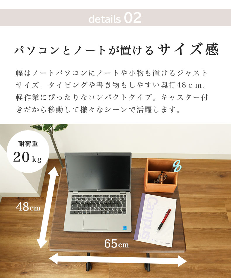 幅はノートパソコンにノート小物も置けるジャストサイズ。タイピングや書き物もしやすい奥行き48cm。