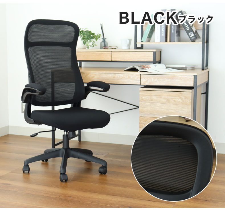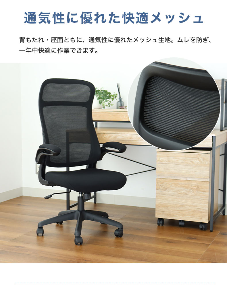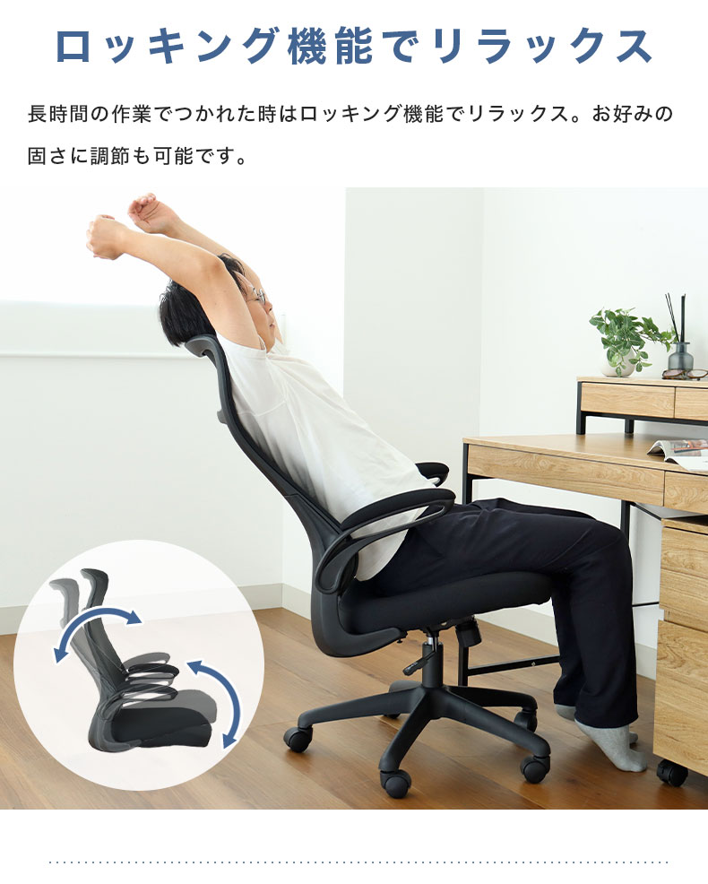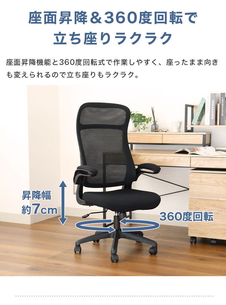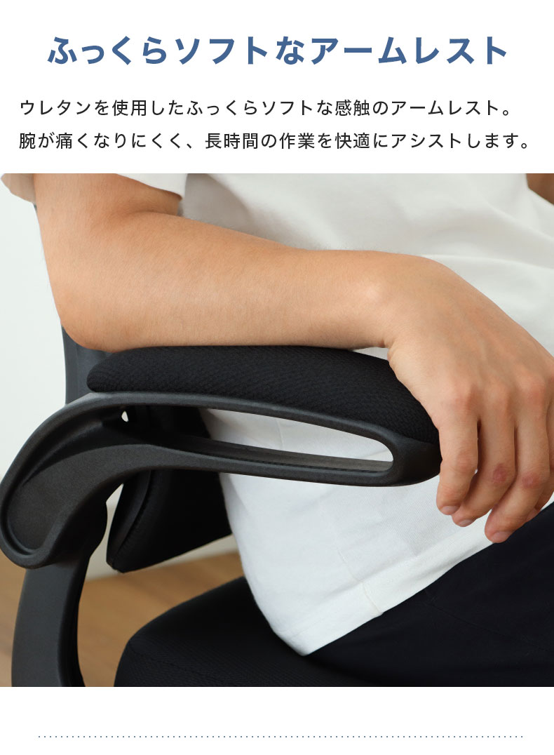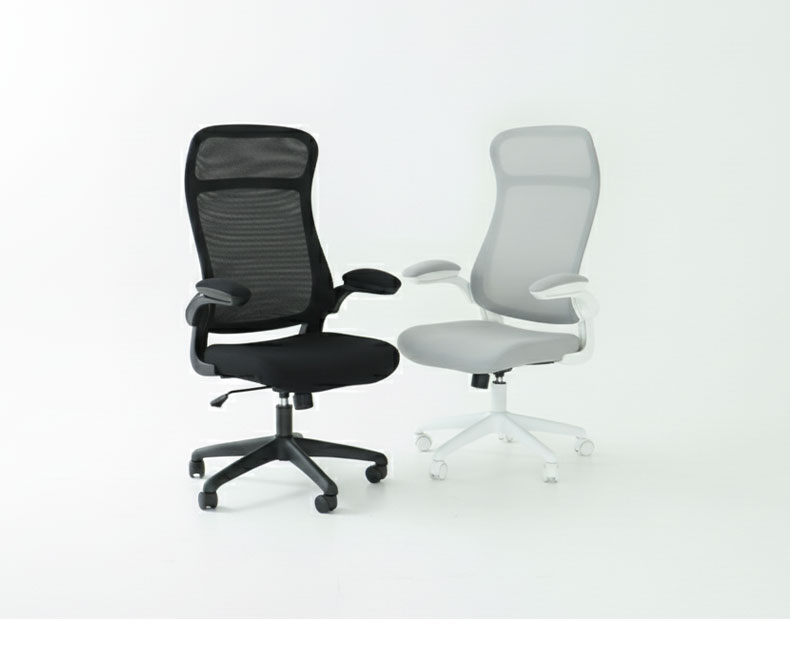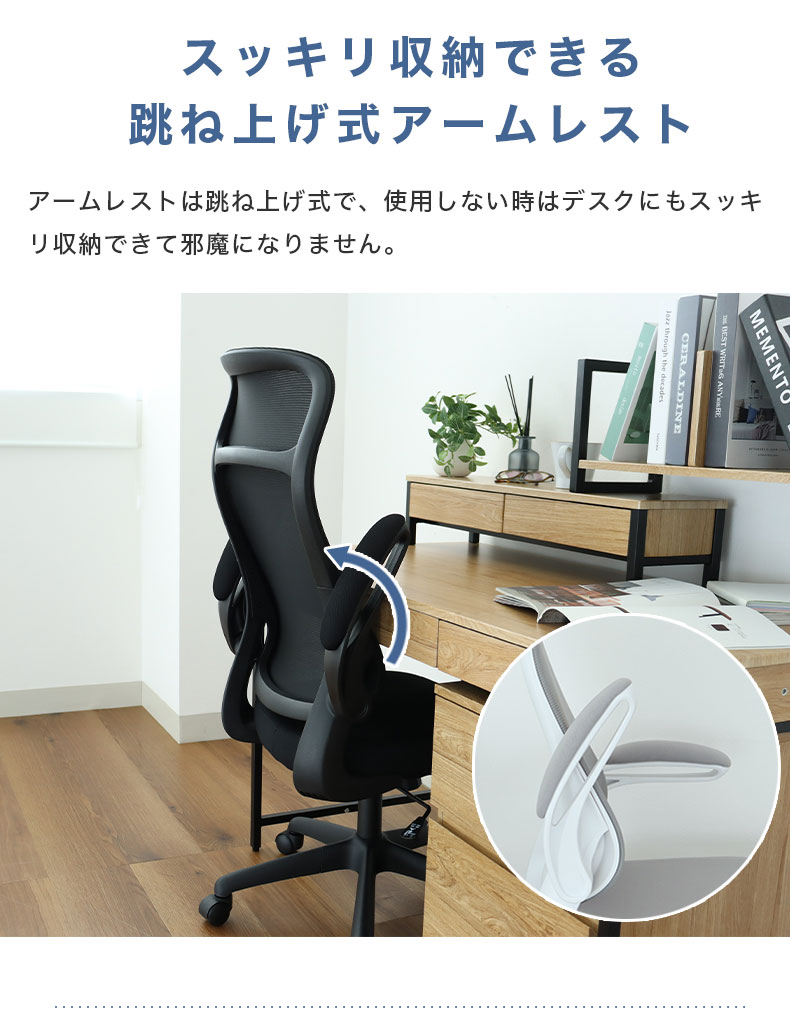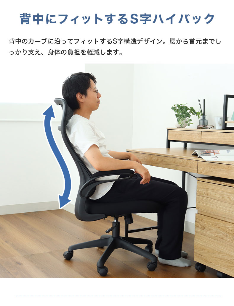 背中にフィットするS字構造で疲れ知らずの座り心地のワークチェア「オルカ」。跳ね上げ式のアームでデスクにすっきり収まります。