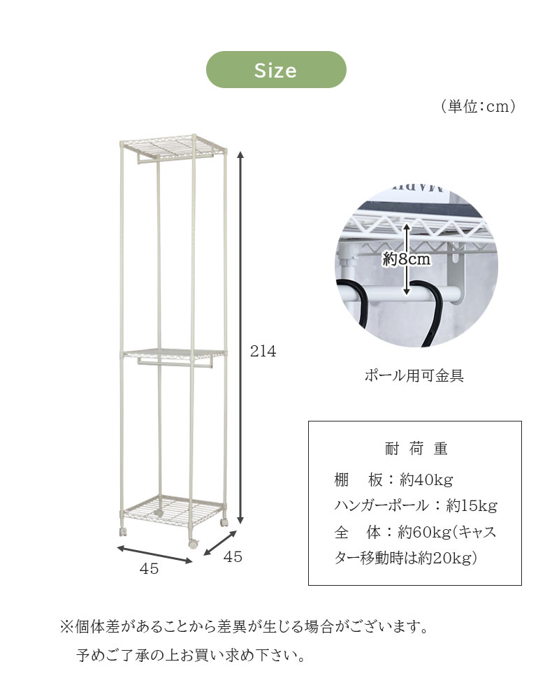 ハンガーポール1本の耐荷重は約15kg。