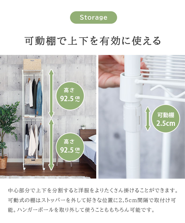 中心部分で上下を分割すると洋服をよりたくさん掛けることができます。