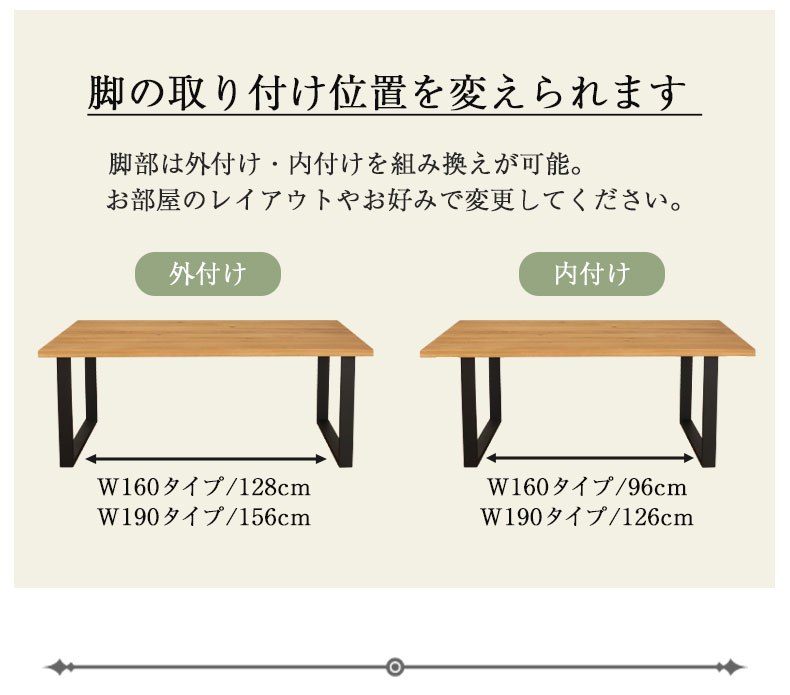 お部屋レイアウトによってお好みで脚の内付け・外付けを組み換えできます。