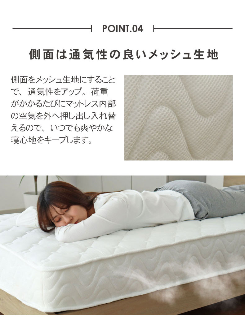 コイル同士に隙間が空く事で内部の通気性が良くなり、快適な寝心地。