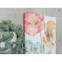 水彩で描かれた3色のキャンバスアート「フラワー2」。気軽にアートを楽しめます。背面には、 壁に掛けられるようにフレームにフック用の穴が開いています。