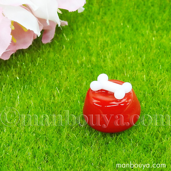 かわいい赤色に骨が1本乗ったデザイン。ガラス細工の犬と合わせてのディスプレイに。