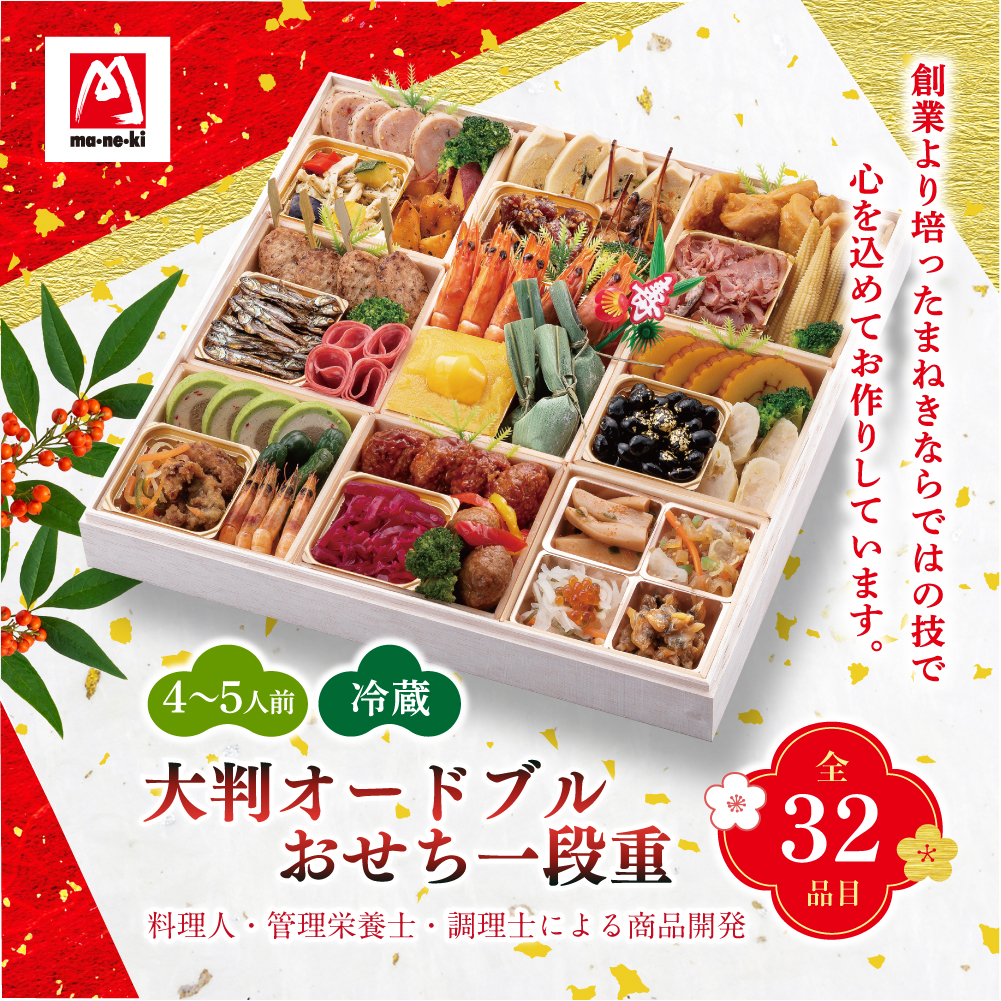 【冷蔵・送料無料】大判オードブルおせち一段重|32品目入り|12月31日お届け|4〜5人前