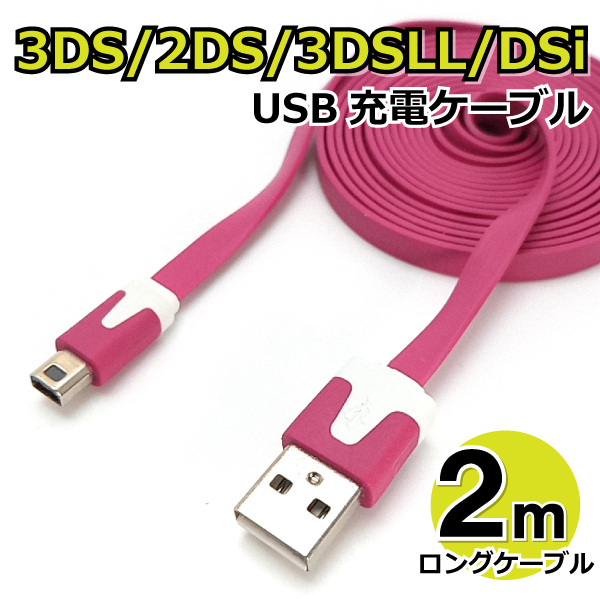 3DS USB充電ケーブル 2m フラットタイプ 2DS/3DS/3DSLL/DSi/DSiLL/new兼用 充電器 AD-3DSlongCA【ピンク】
