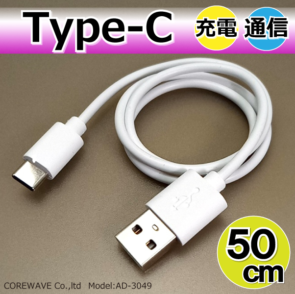 Type-c 充電通信ケーブル 50cm ホワイト USB2.0 充電・通信対応 最大3A 送電 Android Galaxy Xperia AQUOS AD-3049