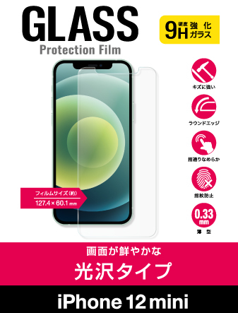 iPhone12mini 対応 ガラスフィルム ■キズや衝撃に強い表面硬度9Hガラスを採用■ガラス角が丸く手にやさしいラウンドエッジ加工 ■薄型0.33mm ■指通りなめらかで指紋や汚れがつきにくい■万一ガラスが割れても飛び散りにくい飛散防止加工■付属品・・使い捨てウェットクリーナーx1 使い捨てドライクリーナーx1 ■対応機種 iPhone12mini■サイズ 127.4x60.1mm(5.4inch)
