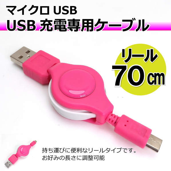 マイクロUSB充電専用ケーブル お好みの長さに一発調整! リールタイプ70cm◆パソコンなどの機器から充電ができるケーブル◆巻き取り式のケーブルなので持ち運びに便利。使わないときはコンパクトに収納可能。◆ケーブル長さ:約70cm(最長まで引き伸ばした場合) ◆コネクタ形状:microUSB(B)オス----USB-A(オス)◆カラー:ピンク ケーブル:ホワイト