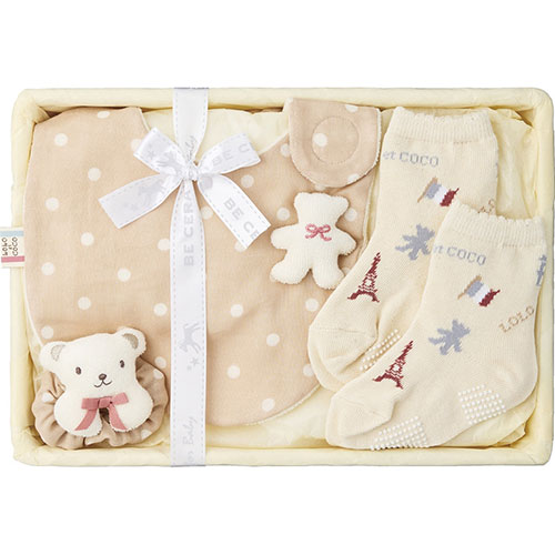 セット内容 : クマモチーフ付スタイ・ソックス(11〜13cm)・リストガラガラ・竹籠(20×29.5×7cm)×各1