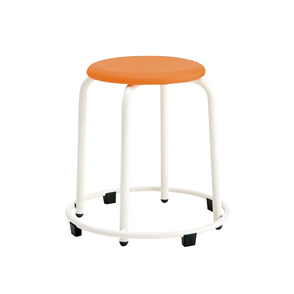 ステップがついた丸スツール/座面高460mm/オレンジ。ステップ付きで低学年から高学年まで使用できます。リングには樹脂パーツがついているので誤ってふんでも手前に倒れにくい構造です。