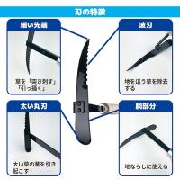 お庭の手入れで欠かせない雑草処理には、使う道具の選択が大切です。雑草を除去する道具には、それぞれ目的に合わせた特徴があるのですが、それを全て揃えて使い分けるのは現実的とは言えません。そこでオススメするのが特殊な形状の本製品です。鎌のような形状の道具で、片側の先端は細く鋭利で、「突き刺す」「引っ掻く」が得意です。もう一つの先端は、幅が広くなっている丸刃があり、太い茎の草の根を引き起こすことが可能です。側面の片側には波型になっている刃があり、地面を這うような草の除去などに使えます。波刃部分の右側には刃が付いていないので、この部分を使って地慣らしができます。
