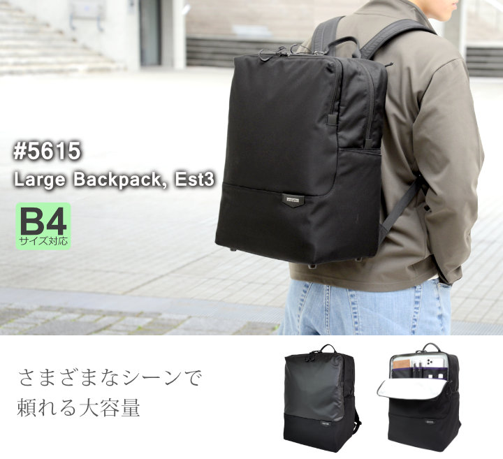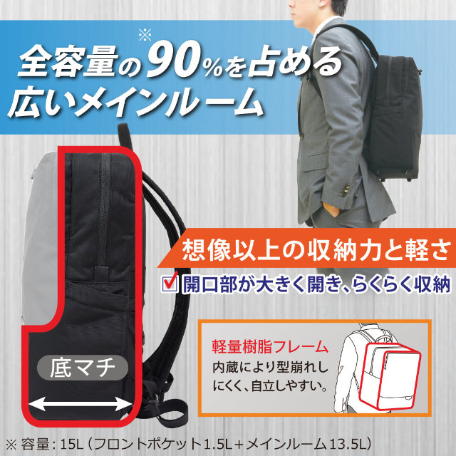 24リットルの容量を備えたB4サイズ対応のバックパック。メインルーム底部のマチ幅が広く、収納空間を大きく確保した構造となっているため、スマートなデザインで軽量ながらも高い収納力を誇ります。ブラックと特殊コーティング生地を採用したコンビネーションデザインの2タイプです。