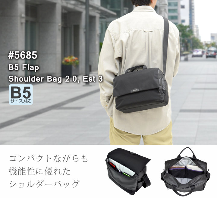 フロントルームにアクセスしやすいフラップ開閉式のB5サイズ対応ショルダーバッグです。前面フラップの開閉には隠しマグネットを採用。本体には特殊コーティング生地を使用したコンビネーションデザインで、スマートな印象に仕上げています。手持ちハンドル付きの2WAY仕様で、通勤・通学はもちろん、お出かけや街歩きなどカジュアルなシーンにも対応します。