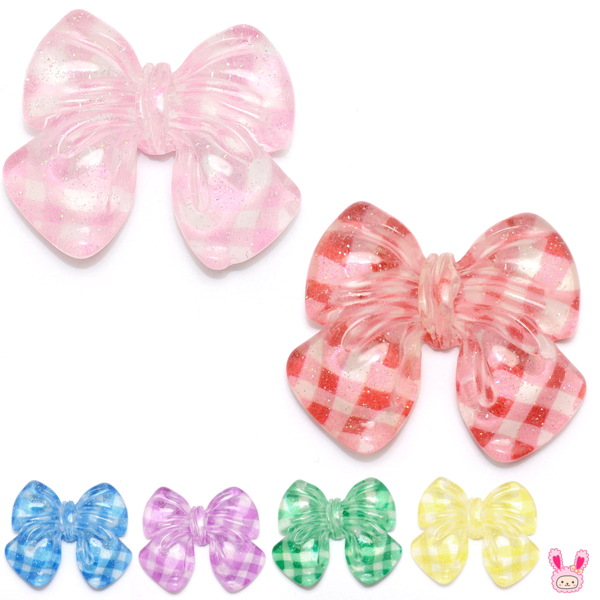 デコパーツ カラフルチェックのラメ入りリボンパーツ 4個