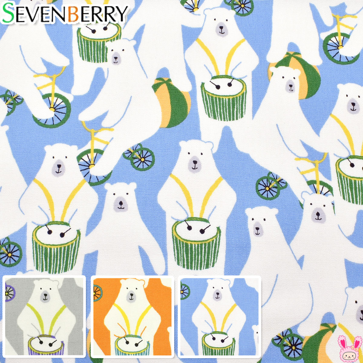 白い体の北極グマたちが、小太鼓を叩いたり三輪車に乗ったり、玉乗りを披露する楽しいデザインの生地です。にこやかに大道芸を楽しむ愛らしい姿がユーモラスでほっこりと癒されます。動物やクマ柄が好きな方にぴったりのデザインで、ポーチやバッグ、キッズアイテムはもちろん、子供部屋のカーテンやクッションなどのインテリアにもおすすめです。ほんわかした雰囲気をプラスして、楽しい作品作りをお楽しみください。