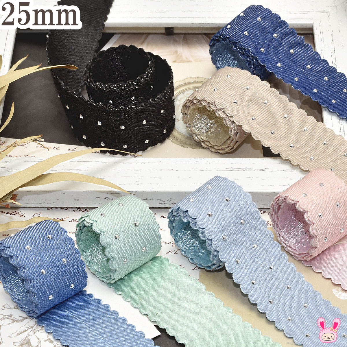 シルバードットストーンとデニム風スカラップリボン 幅25mm 1m単位 切り売り ○
