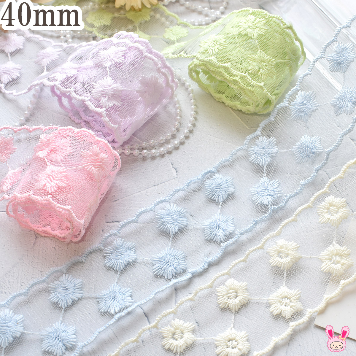 スカラップとメッシュとかわいいお花の刺繍リボン 幅40mm 1m単位 切り売り (2m以上)