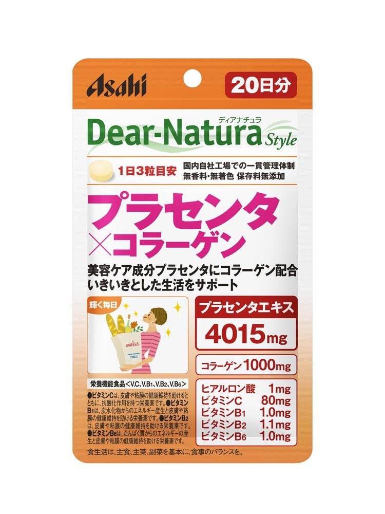 ※製造工程中で、3粒中に豚プラセンタエキス末146mg[プラセンタエキス換算4015mg]、コラーゲン1000mg、ヒアルロン酸1mgを配合しています。