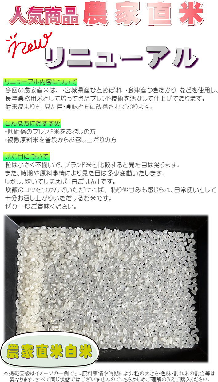 今回の農家直米は、 ・宮城県産ひとめぼれ ・会津産つきあかり など を使用し、長年業務用米として培ってきたブレンド技術を活かして仕上げております。