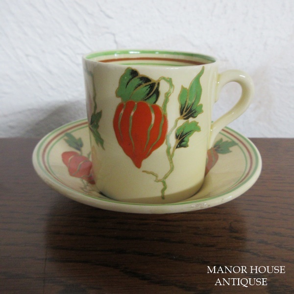 イギリスより入荷致しましたアンティーク雑貨 英国製Royal Doultonの デミタスカップアンドソーサーです。デミタスカップアンドソーサー1セットの出品となります。クリーム色が優しく、ほうずきのプリントが素敵なお品です。イギリス最大級の陶磁器メーカー「ロイヤル・ドルトン」は、「陶器の里」として有名なストーク・オン・トレントのsix townsの一つであるBurslemにて1815年創業。このお品は"GEM"パターンで、1930年頃に作られたものと思われます。カップにヒビがございますので、ディスプレイ用として出品いたします。気になる方はご注文をお控え下さい。