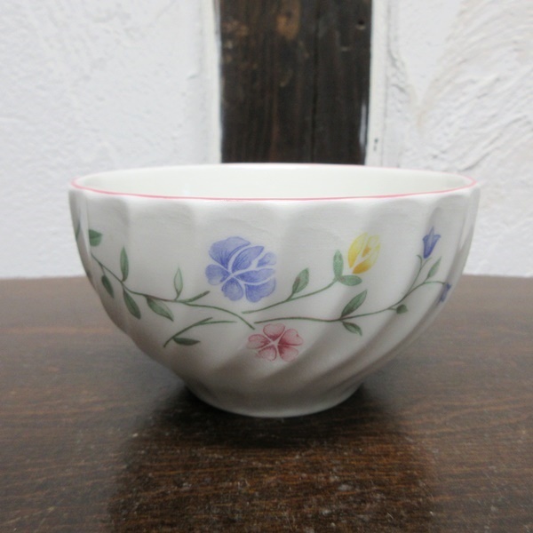 イギリスより入荷致しましたキッチン雑貨 英国製シュガーボウルです。底にエンボスで“MADE IN ENGLAND”とございます。優しい色合いの花柄にピンクのラインが素敵なお品です。