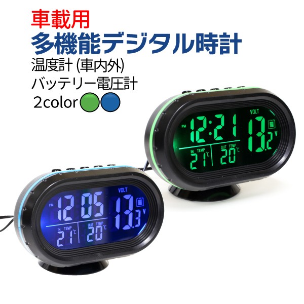 車用 多機能 デジタル時計 クロック バッテリー 電圧計 付き 車内・車外 温度センサー 搭載 12V専用 シガーソケット電源 アラーム機能 スヌーズ機能