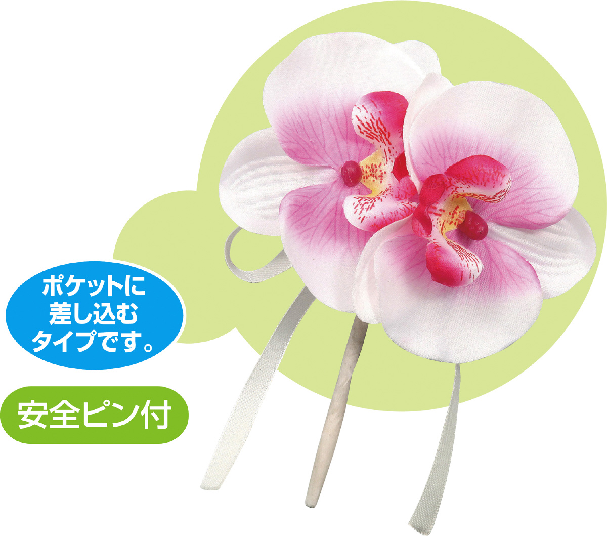 ふんわり軽やかな花びらが素敵な胡蝶蘭に新色登場!(ピンク)胸に飾れる安全ピン付ポケットにさしこめます。