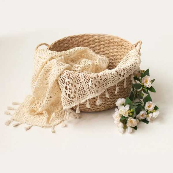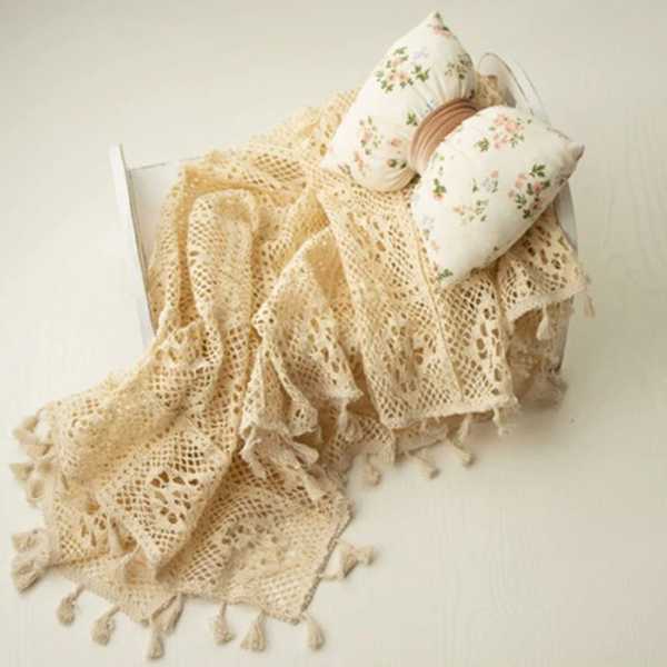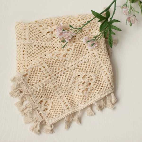 【互換品】ヴィンテージコットンタッセル付きベビーブランケット 写真アクセサリー 新生児用透かし彫りカバ