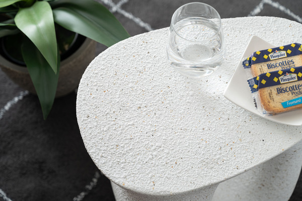 石目調の仕上がりとなっており、表面のざらざらとした質感とユニークな形が特徴のトレンド感があるサイドテーブル。