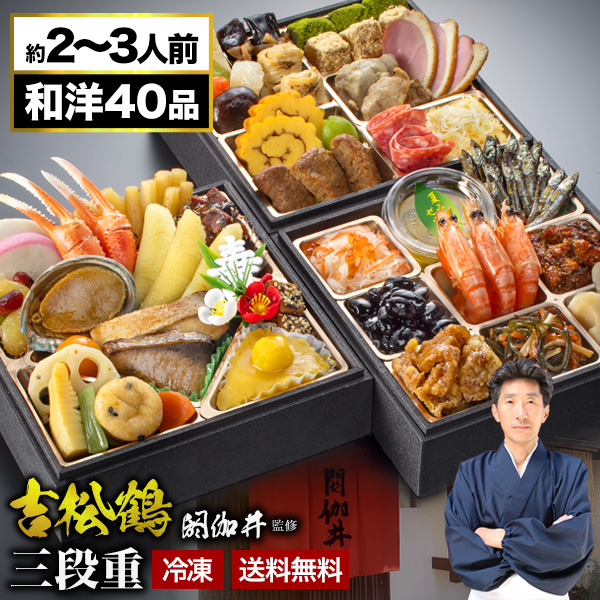 | 【吉松鶴】40品目 約2〜3人前 セット品:祝箸3膳、風呂敷、お品書き <壱の重>(計14品) 蒲鉾(紅)、蒲鉾(白)、三色豆、田舎煮、たたき牛蒡、鮪昆布、ごまポテト、芋金団、栗甘露煮、かに爪、味付数の子、蝦夷鮑旨煮、鰤照り焼、金柑甘露煮 <弐の重>(計10品) 紅白なます、いくら醤油漬け、夏みかんゼリー、田作り、黒豆、有頭海老艶煮、真鱈子昆布、おつまみ鶏皮、松前漬け、筑前煮 <参の重>(計16品) 高野豆腐、花こんにゃく(白)、花こんにゃく(紅)、椎茸旨煮、さやえんどう、一口にしん昆布巻、焼湯葉巻、伊達巻、若桃甘露煮、ハンバーグ、わらび餅(抹茶)、わらび餅(きな粉)紅茶合鴨スモーク、紅茶合鴨炭火焼、ソフトサラミスライス、数の子サラダ |