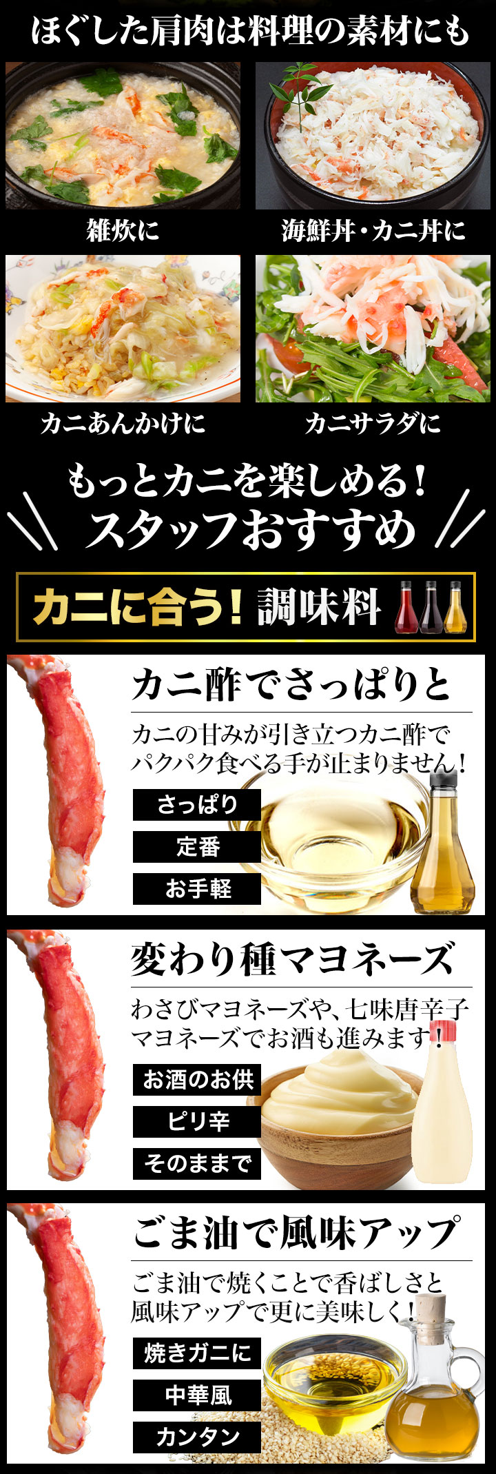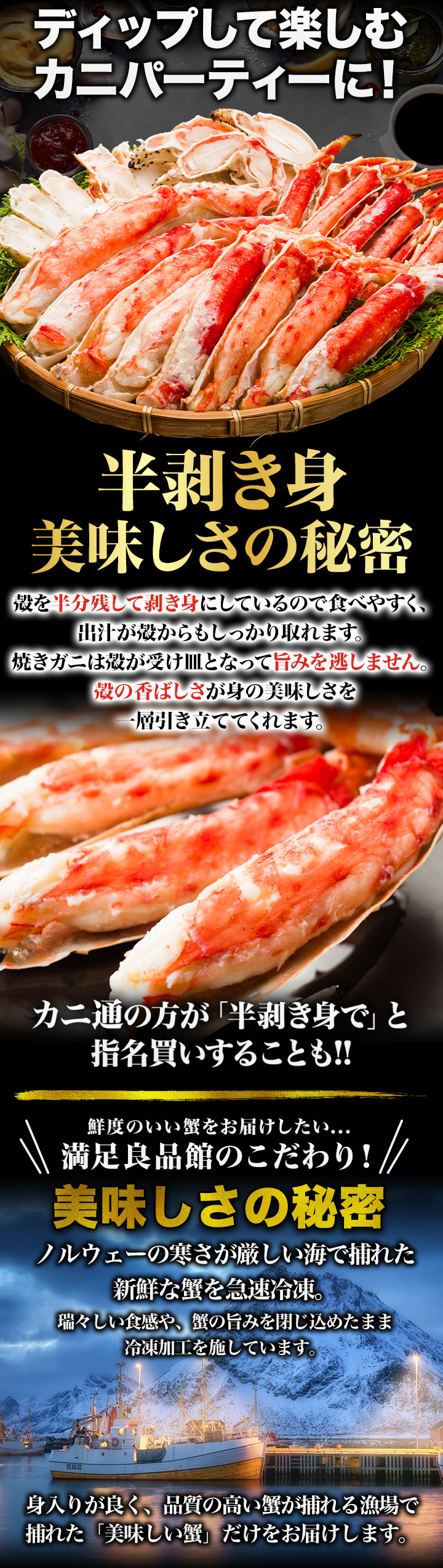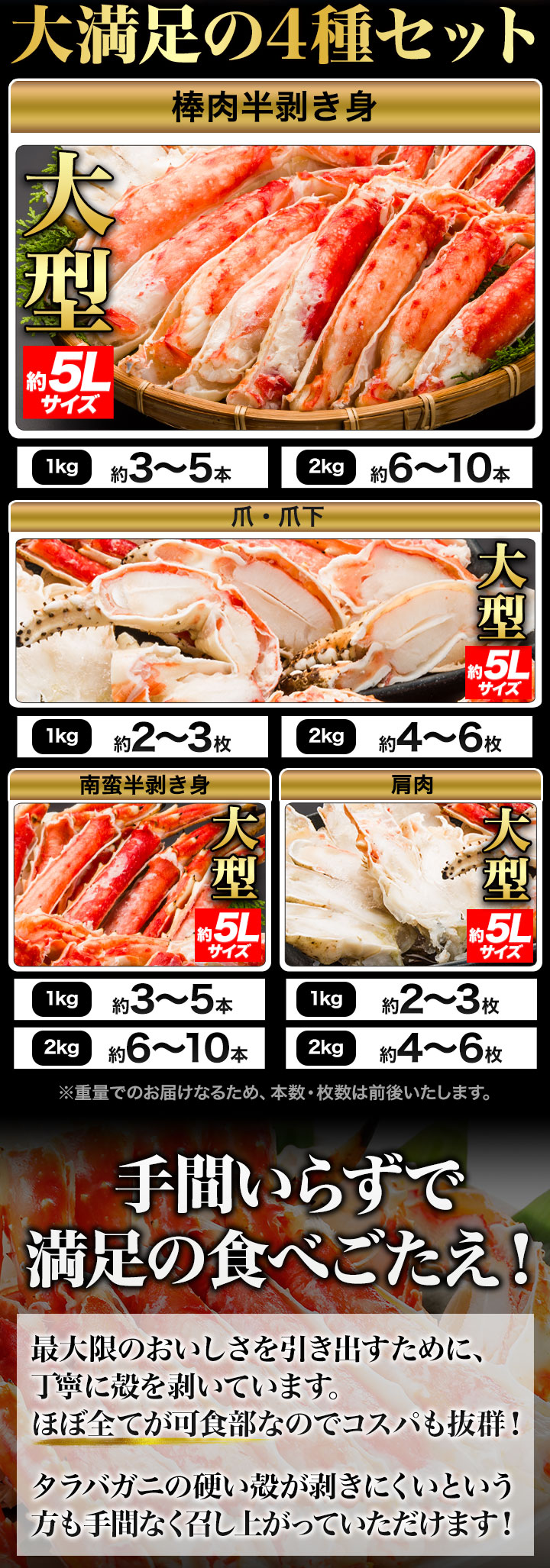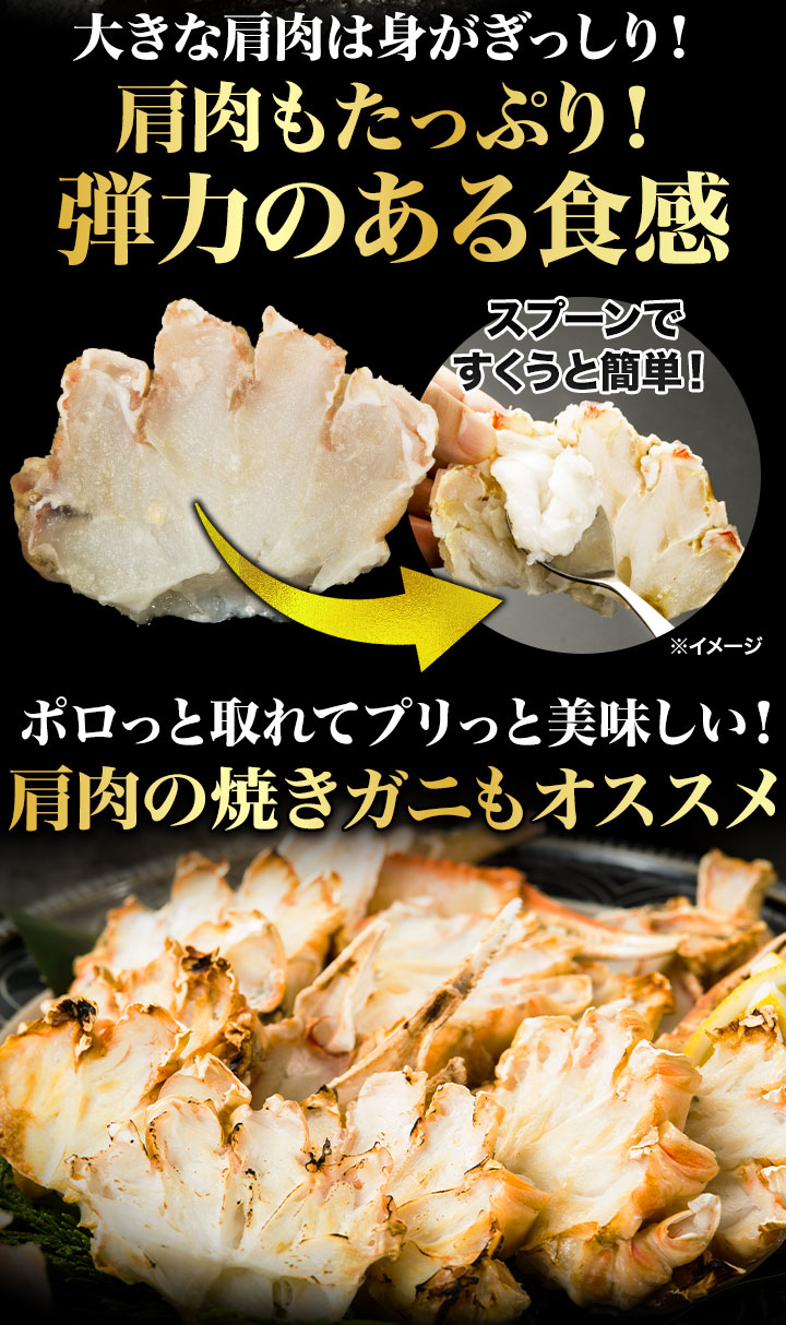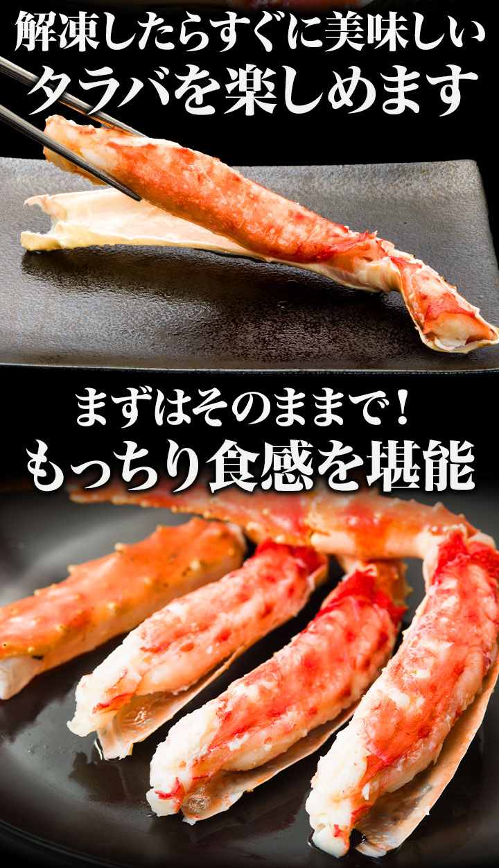 | 1kg(正味重量800g) 太脚部ハーフカット:約3〜5本 爪・爪下センターカット:約2〜3枚 南蛮ハーフカット:約3〜5本 肩肉センターカット:約2〜3枚 2kg(正味重量1.6kg) 太脚部ハーフカット:約6〜10本 爪・爪下センターカット:約4〜6枚 南蛮ハーフカット:約6〜10本 肩肉センターカット:約4〜6枚 ※重量でのお届けのため、本数は前後いたします。 ・空気に触れることによる乾燥や酸化を防ぐため氷の被膜をつけて凍らせてお届けいたします。 ・重量は、他社一般に取引される「凍った状態」での重量表記です。 ( )内の正味重量(正味)とは、凍らせる前のカニ正味の重量です。 ・商品のラベルにはカニ正味の重量を記載しています。 |