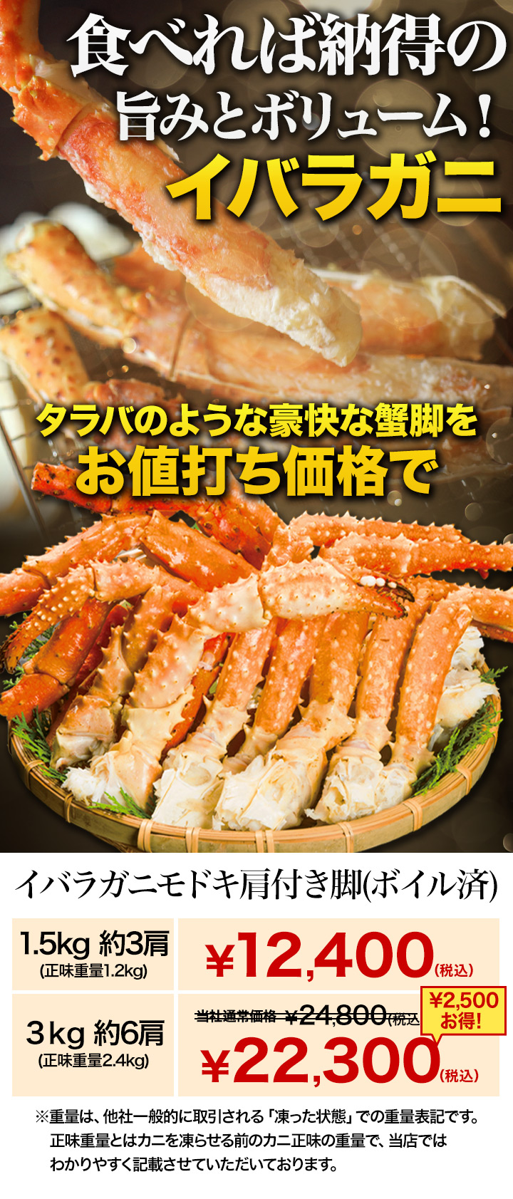 | 【71121】1.5kg (正味重量約1.2kg):約3肩 【71122】3kg (正味重量約2.4kg):約6肩 ※重量でのお届けとなる為、数は目安となります。 ・空気に触れることによる乾燥や酸化を防ぐため氷の被膜をつけて凍らせてお届けいたします。 ・重量は、他社一般に取引される「凍った状態」での重量表記です。 ( )内の正味重量(正味)とは、凍らせる前のカニ正味の重量です。 ・商品のラベルにはカニ正味の重量を記載しています。 |