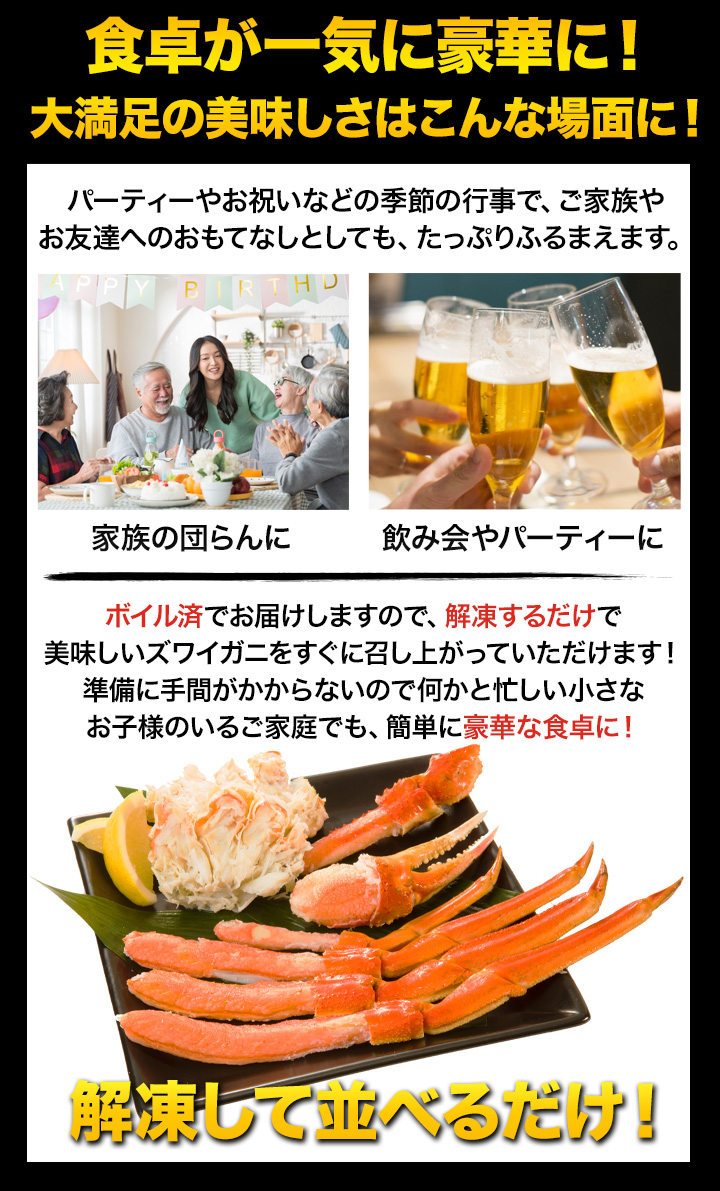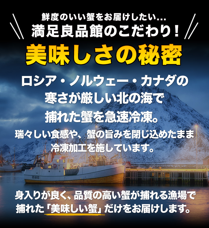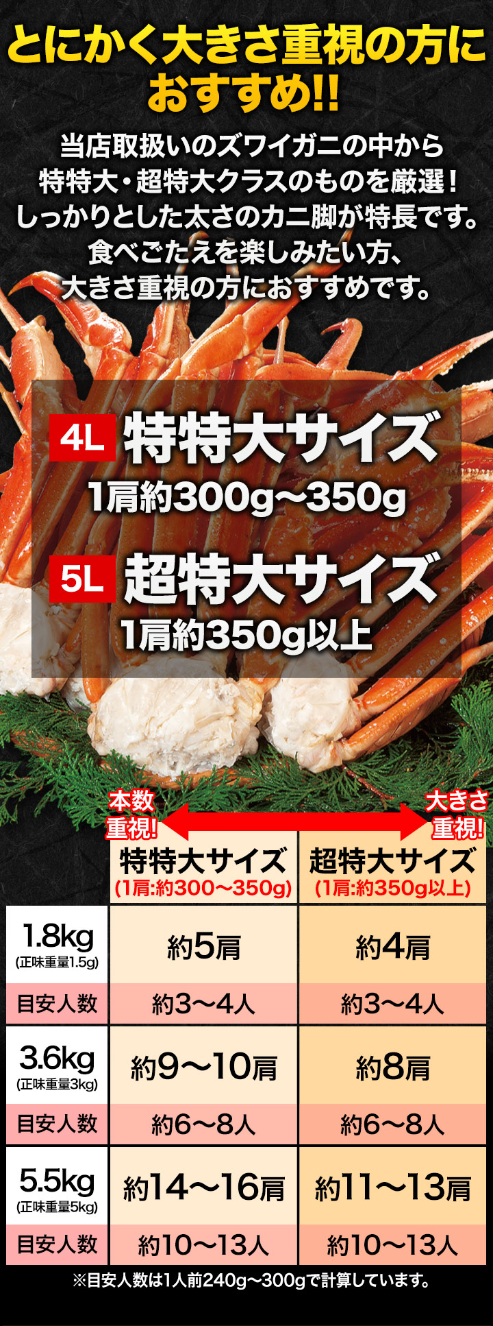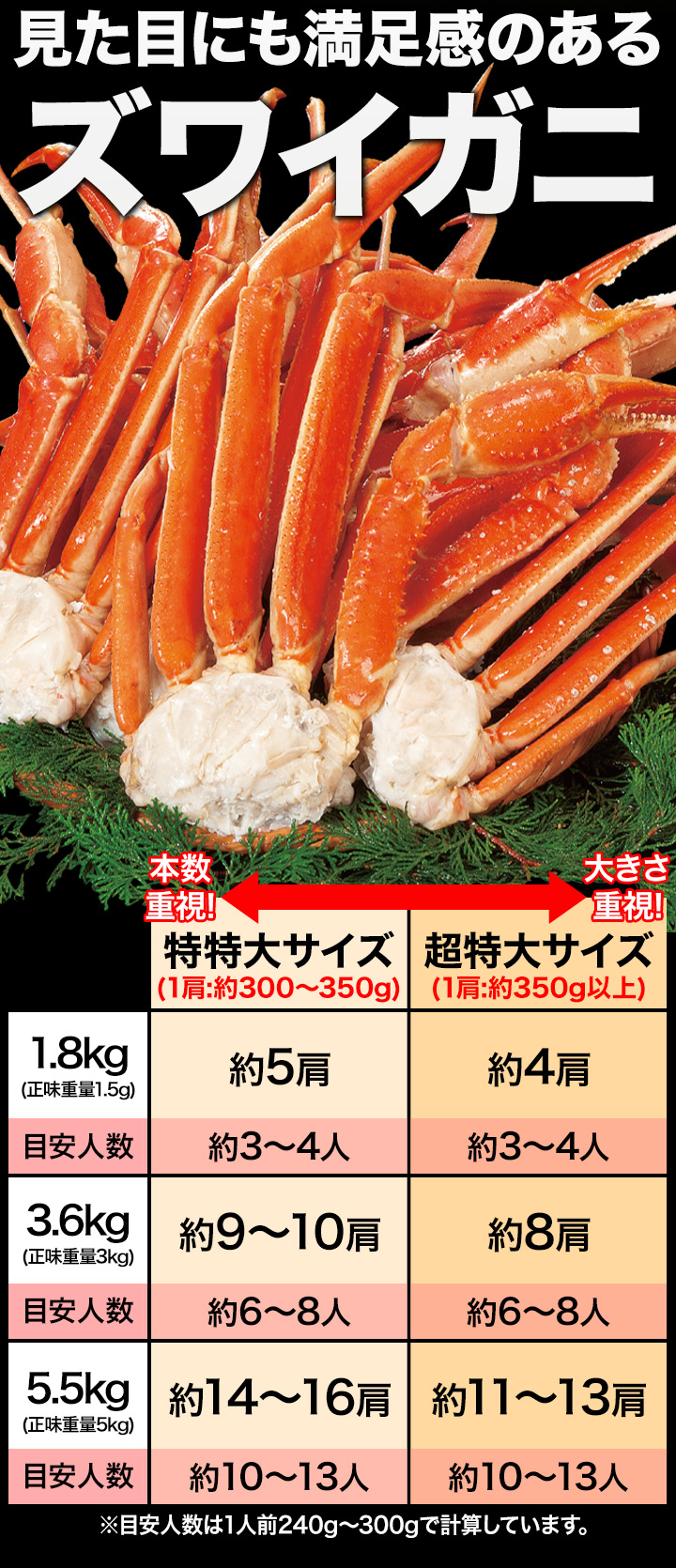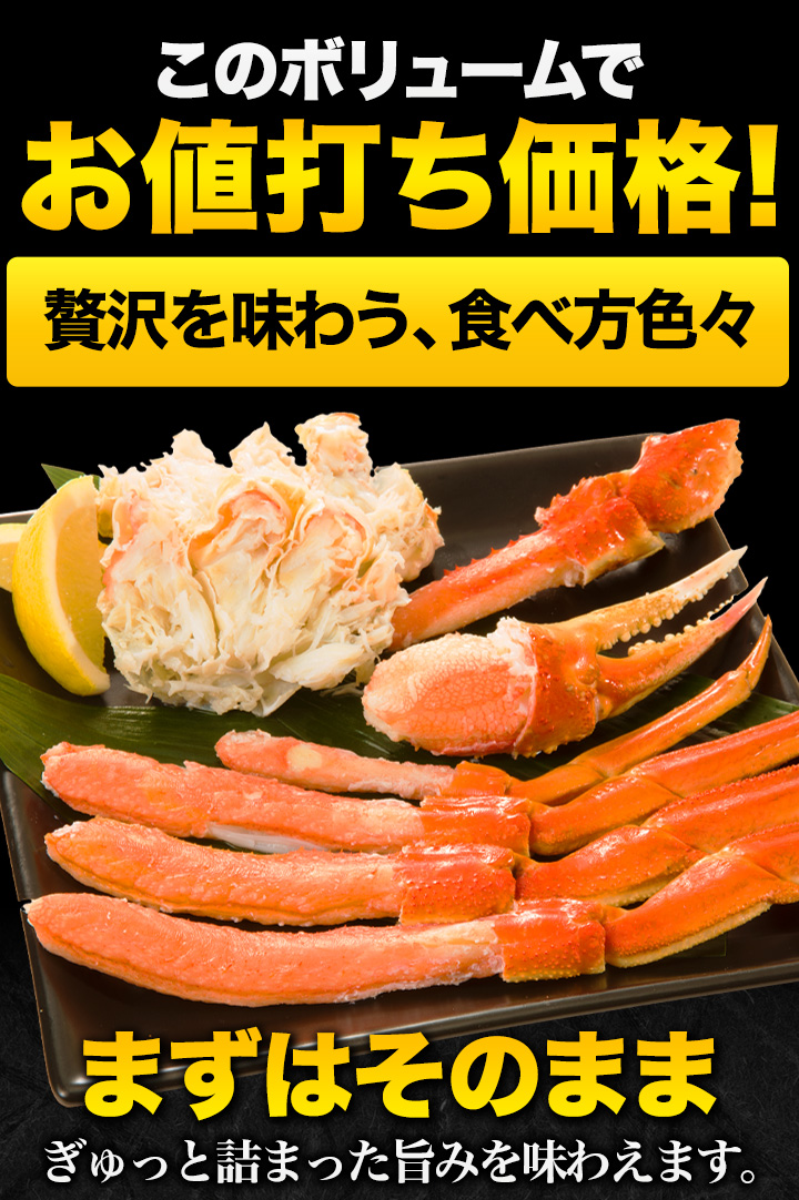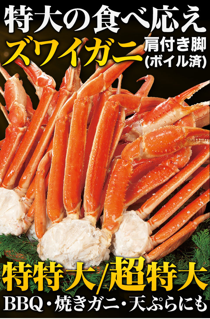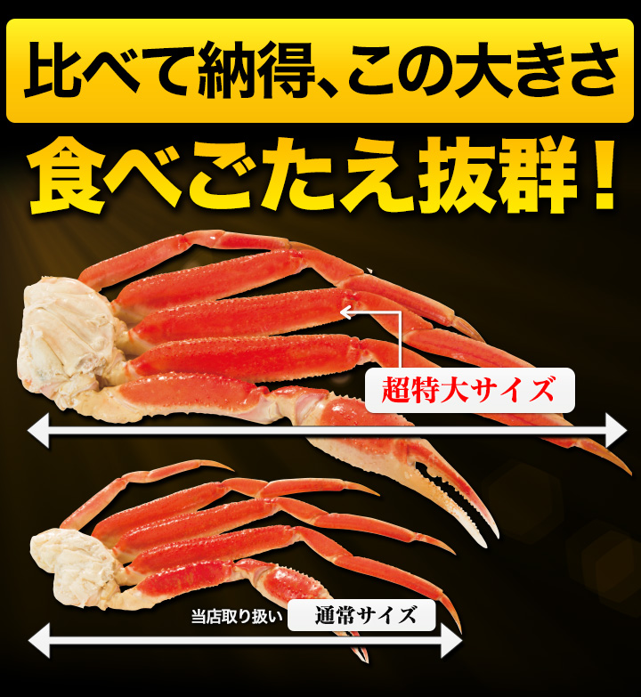 | 【特特大サイズ】 約1.8kg(正味重量1.5kg)約5肩前後 約3.6kg(正味重量3kg)約9〜10肩前後 約5.5kg(正味重量5kg)約14〜16肩前後 【超特大サイズ】 約1.8kg(正味重量1.5kg)約4肩前後 約3.6kg(正味重量3kg)約8肩前後 約5.5kg(正味重量5kg)約11〜13肩前後 ※足し脚、折れが混ざる場合があります。 ※肩数は前後する可能性がございます。 ・空気に触れることによる乾燥や酸化を防ぐため氷の被膜をつけて凍らせてお届けいたします。 ・重量は、他社一般に取引される「凍った状態」での重量表記です。 ( )内の正味重量(正味)とは、凍らせる前のカニ正味の重量です。 ・商品のラベルにはカニ正味の重量を記載しています。 |