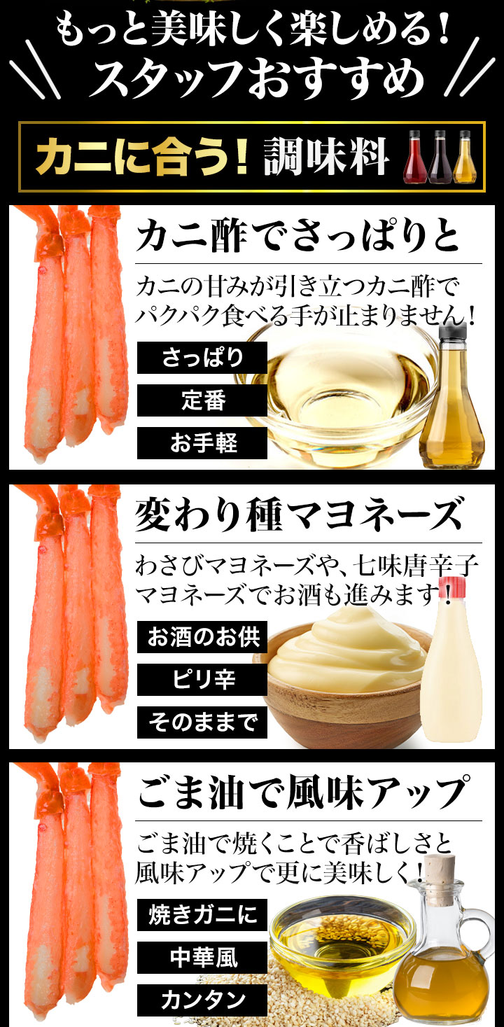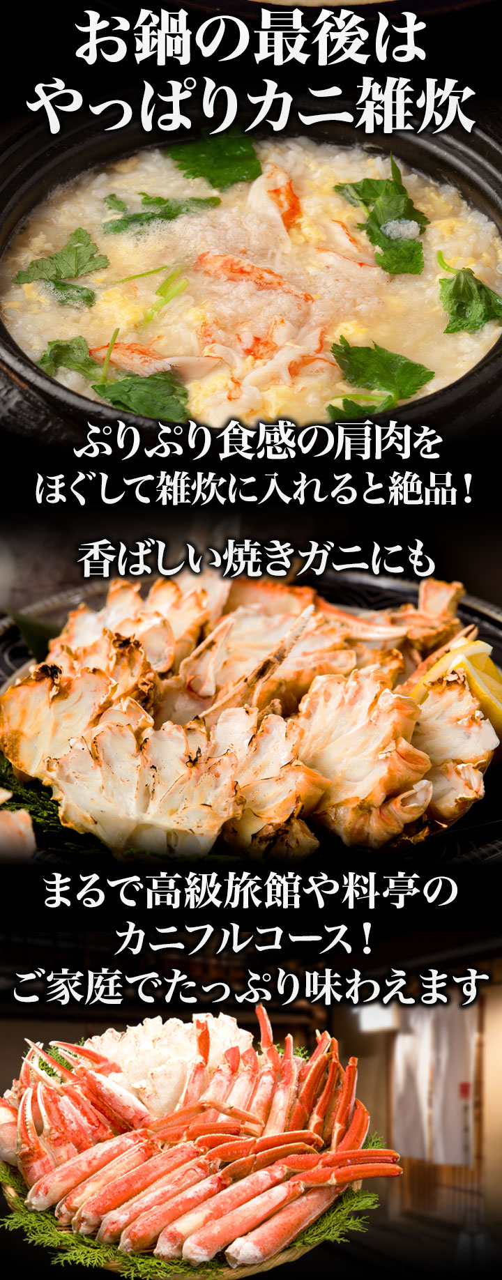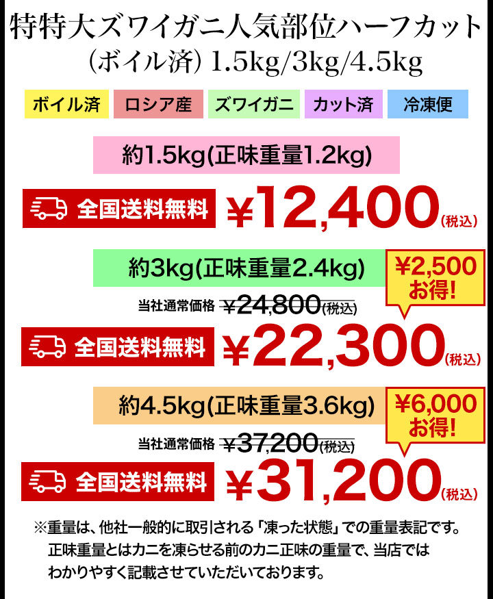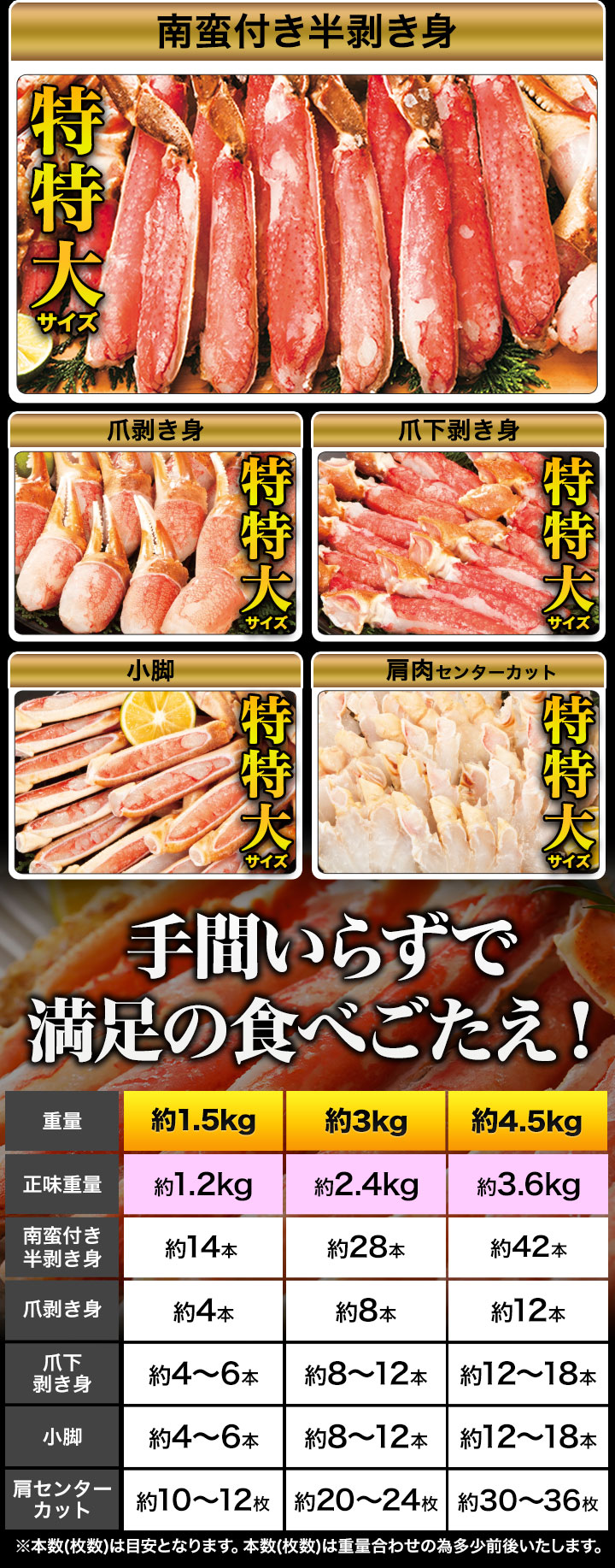 | ・特特大 【71199】約1.5kg(正味重量1.2kg) 【南蛮付脚剥き身/ハーフポーション】約14本前後 【爪剥き身/フルポーション】約4本前後 【爪下剥き身/フルポーション】約4〜6本前後 【肩肉/センターカット】約10〜12枚前後 【小脚/そのまま】約4〜6本前後 【71200】約3kg(正味重量2.4kg) 【南蛮付脚剥き身/ハーフポーション】約28本前後 【爪剥き身/フルポーション】約8本前後 【爪下剥き身/フルポーション】約8〜12本前後 【肩肉/センターカット】約20〜24枚前後 【小脚/そのまま】約8〜12本前後 【71513】約4.5kg(正味重量3.6kg) 【南蛮付脚剥き身/ハーフポーション】約42本前後 【爪剥き身/フルポーション】約12本前後 【爪下剥き身/フルポーション】約12〜18本前後 【肩肉/センターカット】約30〜36枚前後 【小脚/そのまま】約12〜18本前後 ※足し脚、折れ、欠けを含む場合もございます。 ※肩数は前後する可能性がございます。 ・空気に触れることによる乾燥や酸化を防ぐため氷の被膜をつけてお届けいたします。 ・( )内の正味重量(正味)とは、氷の被膜をつける前のカニ正味の重量です。 ・商品のラベルにはカニ正味の重量を記載しています。 |