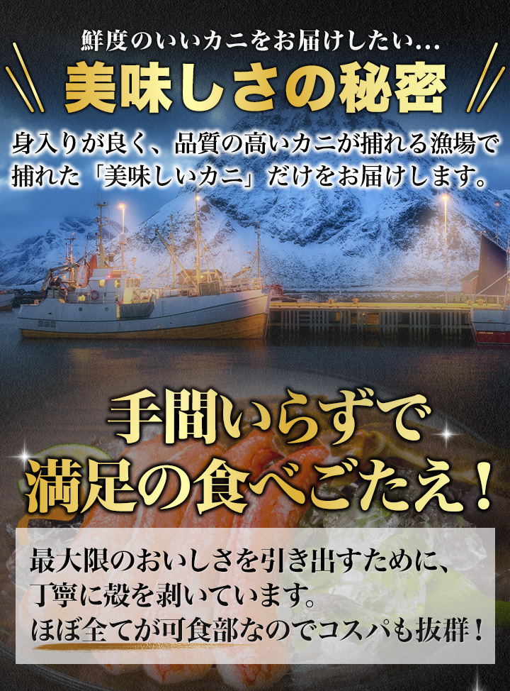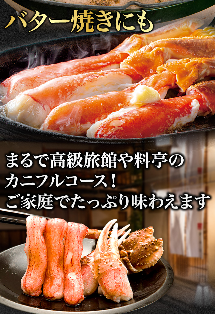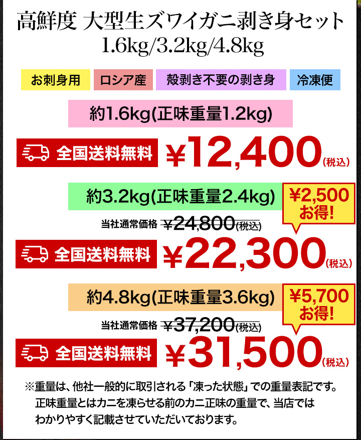 | 【71596】1.6kg(1.6kg×1パック/正味重量1.2kg) 【南蛮付剥き身】約12〜15本 【爪ポーション】約4〜6本 【爪下ポーション】約4〜6本 【小脚削ぎ】約4〜6本 【肩肉ハーフカット】約8〜12枚 【71597】3.2kg(1.6kg×2パック/正味重量2.4kg) 【南蛮付剥き身】約23〜30本 【爪ポーション】約8〜12本 【爪下ポーション】約8〜12本 【小脚削ぎ】約8〜12本 【肩肉ハーフカット】約16〜24枚 【71598】4.8kg(1.6kg×3パック/正味重量3.6kg) 【南蛮付剥き身】約34〜45本 【爪ポーション】約12〜18本 【爪下ポーション】約12〜18本 【小脚削ぎ】約12〜18本 【肩肉ハーフカット】約24〜36枚 ※足し脚、折れ、欠けを含む場合もございます。 ※肩数は前後する可能性がございます。 ※パック数の内訳などは予告なく変更になる場合がございます。 ・空気に触れることによる乾燥や酸化を防ぐため氷の被膜をつけて凍らせてお届けいたします。 ・重量は、他社一般に取引される「凍った状態」での重量表記です。 ( )内の正味重量(正味)とは、凍らせる前のカニ正味の重量です。 ・商品のラベルにはカニ正味の重量を記載しています。 |