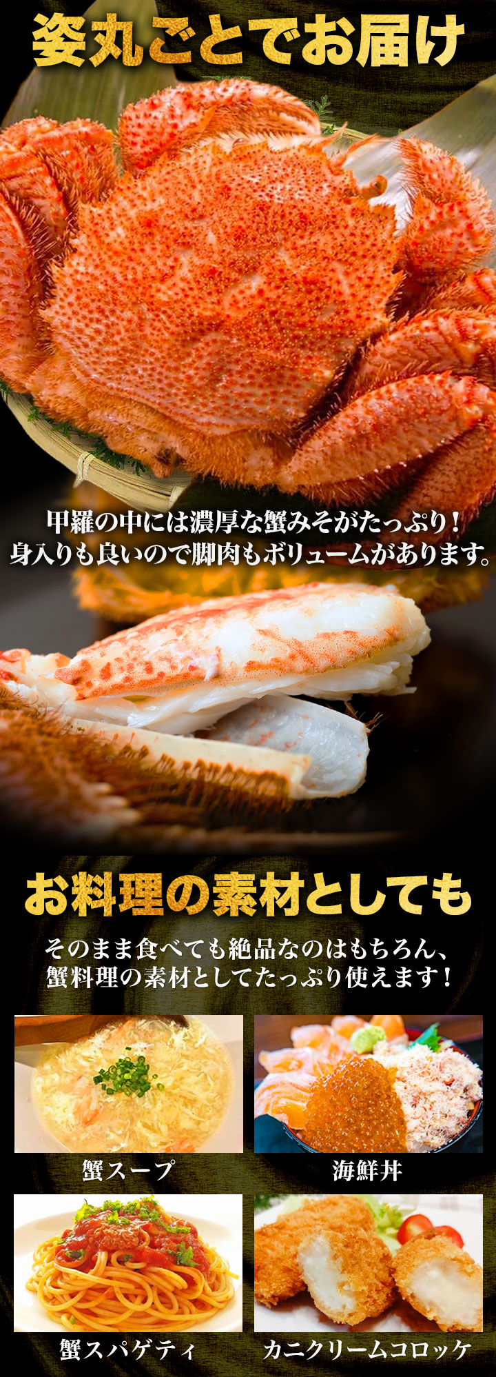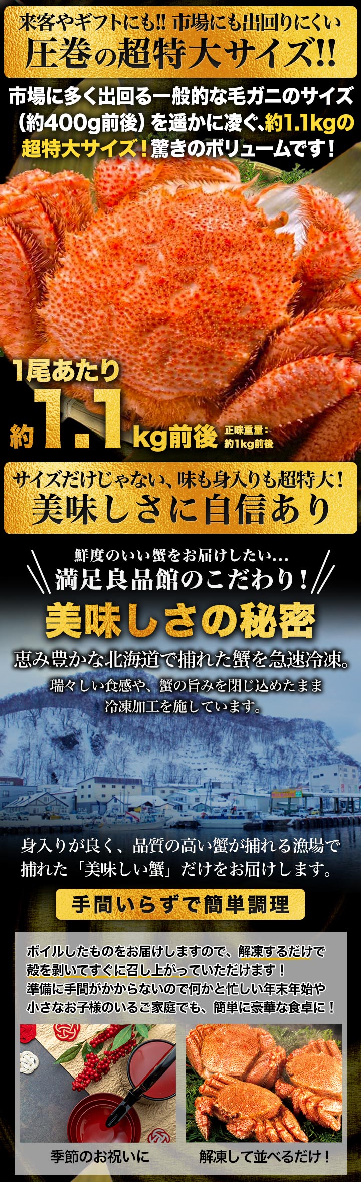 | 【71866】1尾 合計約1.g(正味重量1kg) 【71897】2尾 合計約2.2kg(正味重量2kg) 1尾:約1.1kg前後(正味重量1kg) ※足し脚が混ざる場合があります。 ※尾数でのお届けとなる為、総重量は目安となります。 ・空気に触れることによる乾燥や酸化を防ぐため氷の被膜をつけて凍らせてお届けいたします。 ・重量は、他社一般に取引される「凍った状態」での重量表記です。 ( )内の正味重量(正味)とは、凍らせる前のカニ正味の重量です。 ・商品のラベルにはカニ正味の重量を記載しています。 |