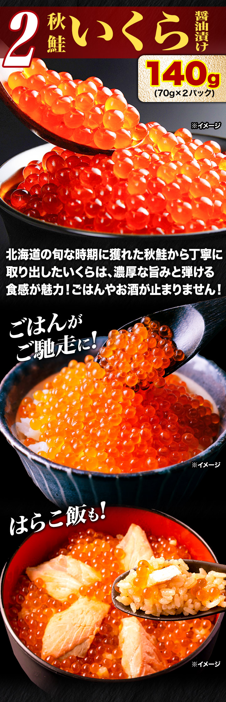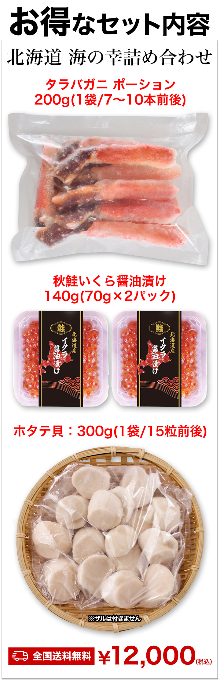| 【タラバガニ ポーション】たらばがに(北海道産) (一部にかにを含む) 【秋鮭いくら醤油漬け】鮭卵(北海道産)、しょうゆ、清酒、みりん (一部に小麦・いくら・大豆を含む) 【ホタテ貝】ほたてがい(北海道産) |