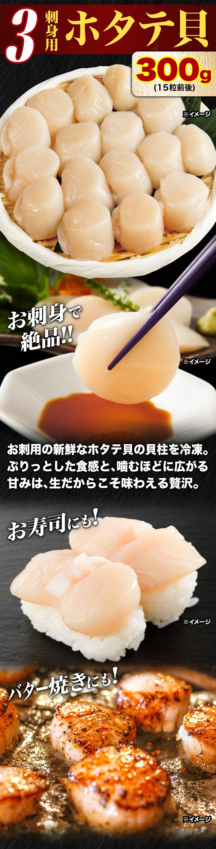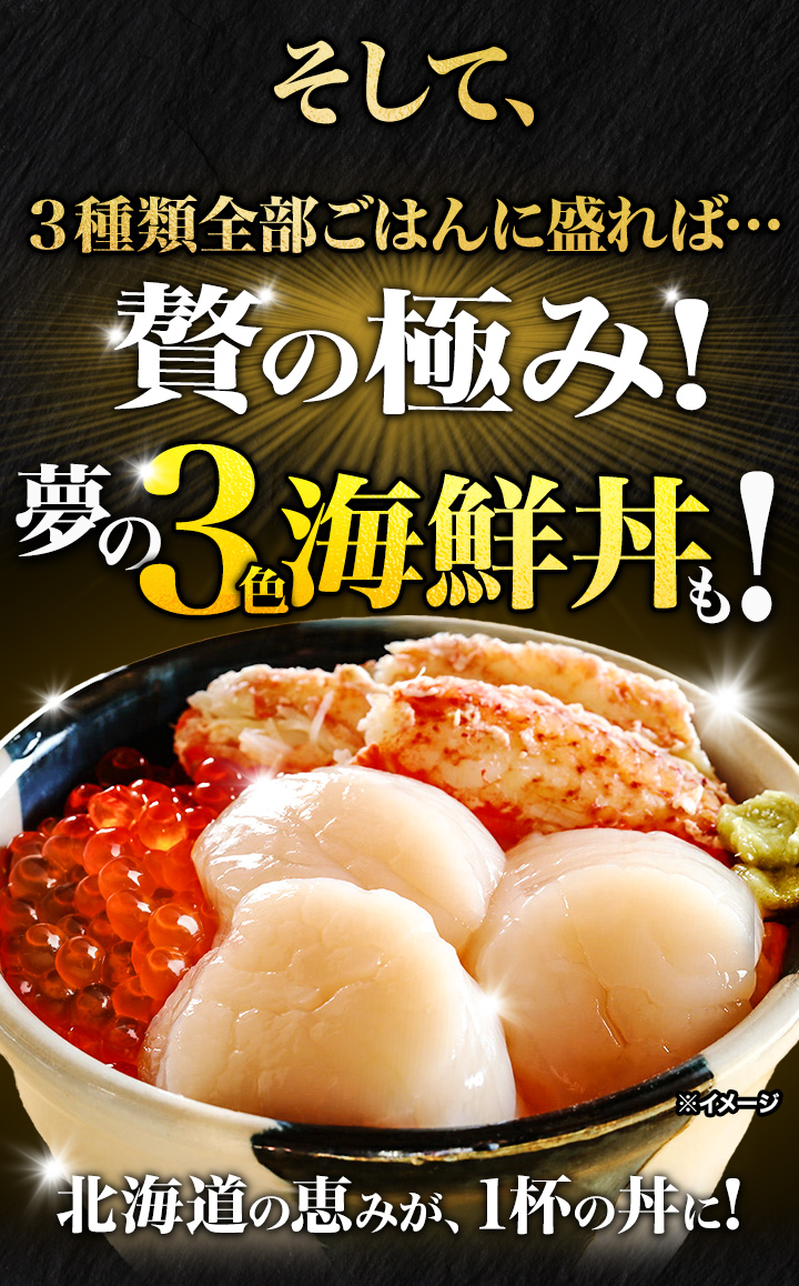 | たらばがに、帆立貝柱は解凍後、そのまま(お刺身として)お召し上がりいただけます。 いくらは解凍後、ご飯等にのせ、お好みで少量のお醤油をかけてお召し上がりください。 |