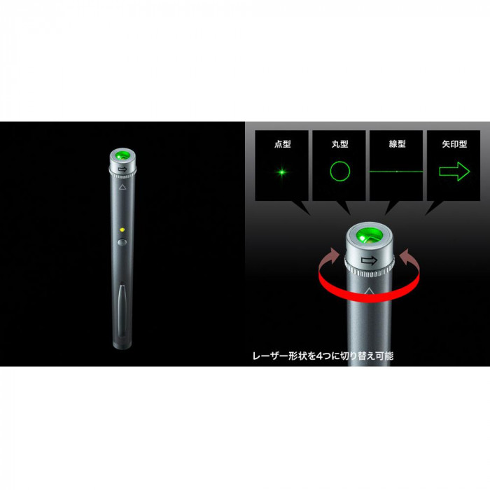 | 点型、丸型、線型、矢印型と、レーザー形状を4つに切り替えることができるので、スライドの内容や会場の広さに合わせた効果的なプレゼンができます。レーザー形状は上部のリングを回すだけで簡単に切り替えることが可能です。クリップ付きで胸ポケットに取り付けられるので、紛失を防ぎ、必要な時手軽に取り出せます。消費生活用製品安全法に基づき、PSCマークの認証を受けています。 ※点型光以外の図形について、レーザー光の使用可能距離は5m以下になります。 |
