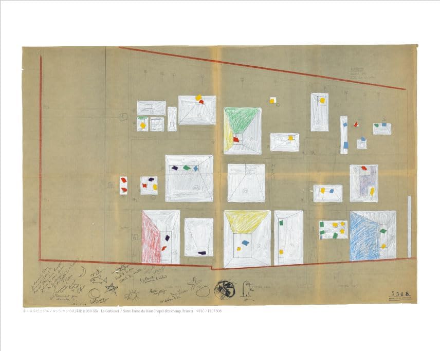 蟹の甲羅から着想を得たという、礼拝堂の印象的な屋根のデザインを、芸術性の高い図面で再現。ル・コルビュジエの独創的な建築世界を身近に感じられる作品です。