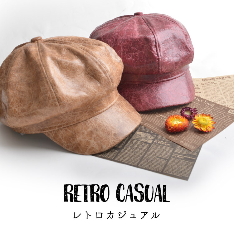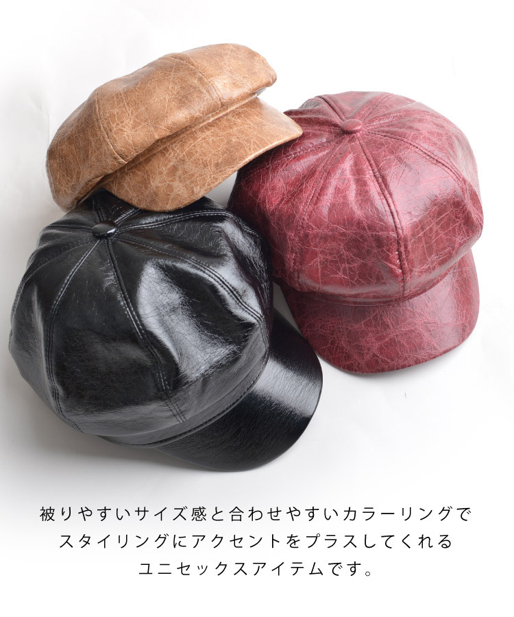 キャスケット レディース メンズ ユニセックス 秋冬 帽子 お洒落 おしゃれ 可愛い シンプル ユーズド加工 クラック加工 ダメージ加工 カジュアル ポリスキャップ 合皮 フェイクレザー ブラック 黒 茶色 ブラウン レッド 赤