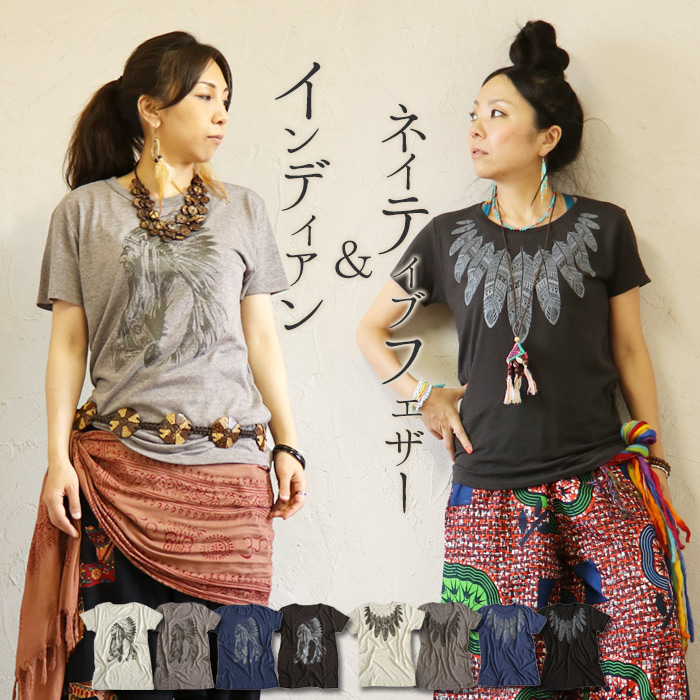 コメント: インディアンとネイティブフェザーの柄がお洒落なTシャツ。インディアンの横顔が凛々しいデザインは、手書きタッチのイラストをプリントしています。 大人っぽい落ち着いたカラーをチョイスし、年齢を問わず着用していただけます。ネイティブモチーフが刻まれたフェザーは、襟ぐりにそって広がる羽根のデザイン。シンプルながらネイティブな雰囲気もあるため、 ナチュラルなエスニックスタイルにぴったり。羽根のデザインはとても繊細な模様が書き込まれており、民族調の風合いも感じられる一枚です。インクは細い線まで再現できる「ラバーインク」を使用。 しっかりと生地に定着させているので、洗濯でインクが取れたりする心配もありません。やや薄手の柔らかな生地が特徴の「トライブレンド」生地。 優しく滑らかな肌触りで肌馴染みも良く、クセになる着心地。ブレンド糸が織りなす、絶妙なヴィンテージテイストをお楽しみください。