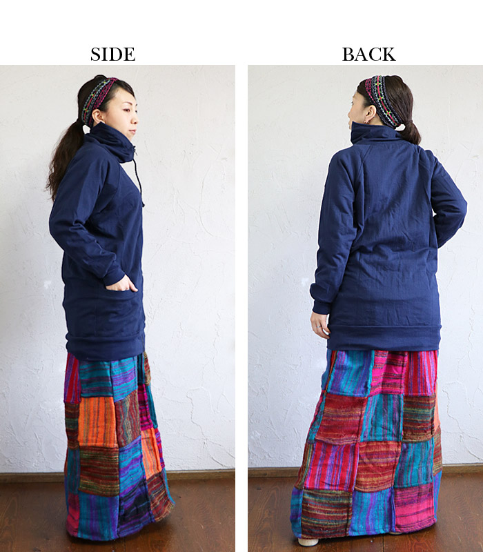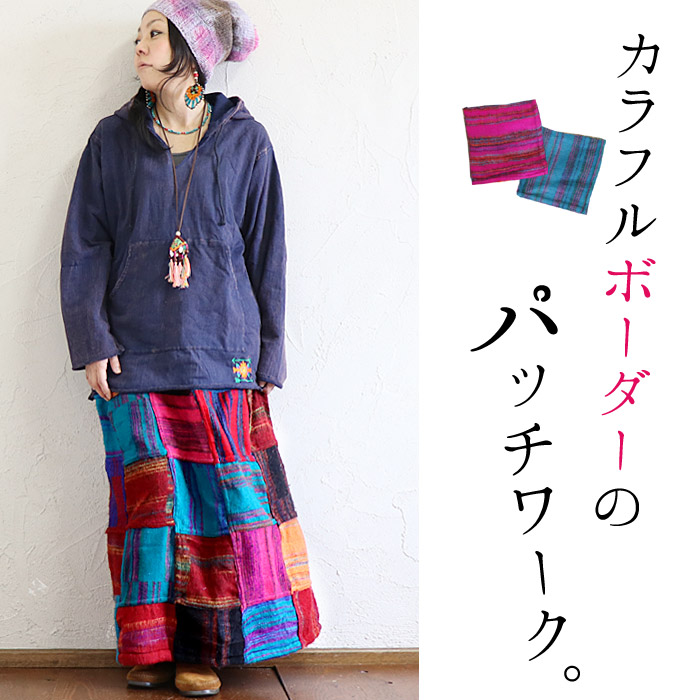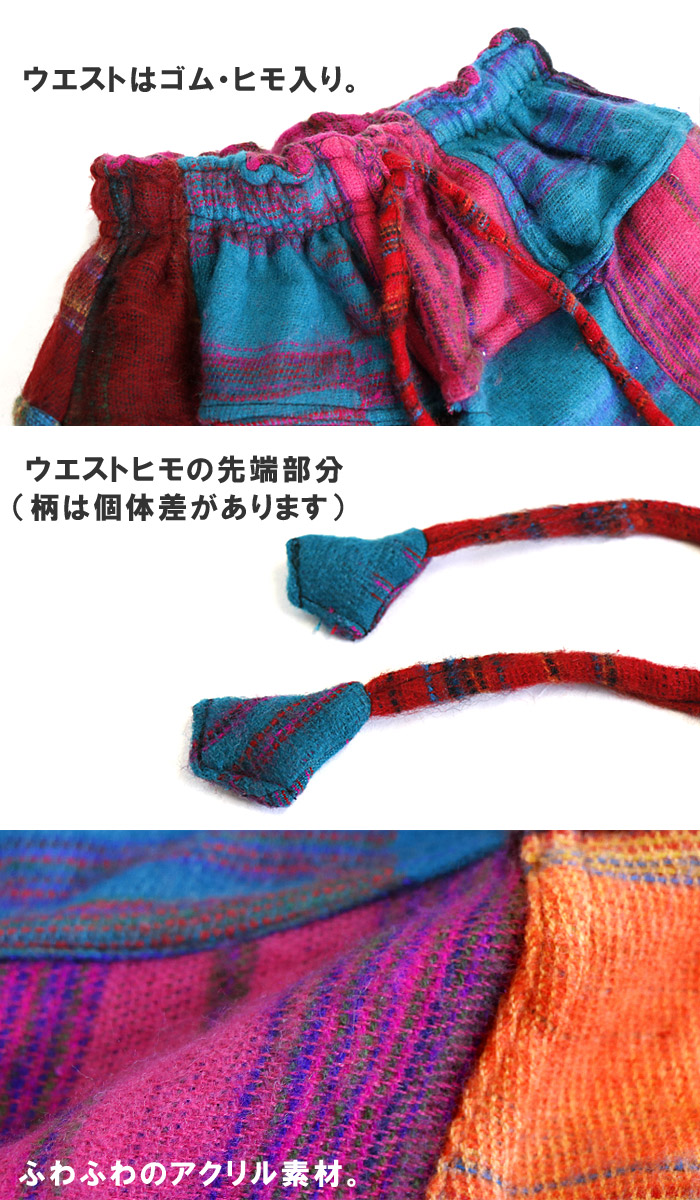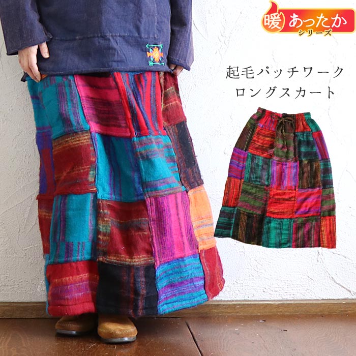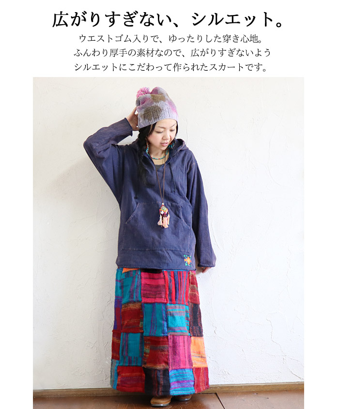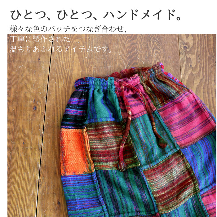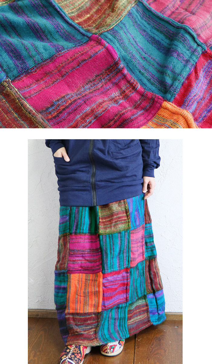 コメント: ネパールで作られた、オリジナルのパッチワークロングスカート。さまざまな色柄の生地をつなぎ合わせたエスニックなデザインが目を引く一枚です。起毛素材を使用しているため、寒い季節もあたたかく、ふんわりとした穿き心地。まるでブランケットに包まれているような温もりを感じられます。レギンスやパンツの上から重ねて穿いて防寒対策にもおすすめ。程よいボリューム感がありつつ、ウエストはゴム仕様でリラックスした着用感です。ゆったりとしたサイズ感で体型カバーにも◎。シンプルなトップスを合わせるだけでコーディネートの主役になり、エスニックスタイルはもちろん、ナチュラルやカジュアルにも取り入れやすい一枚。冬のお出かけや日常使いに、彩りと個性を添えてくれます。