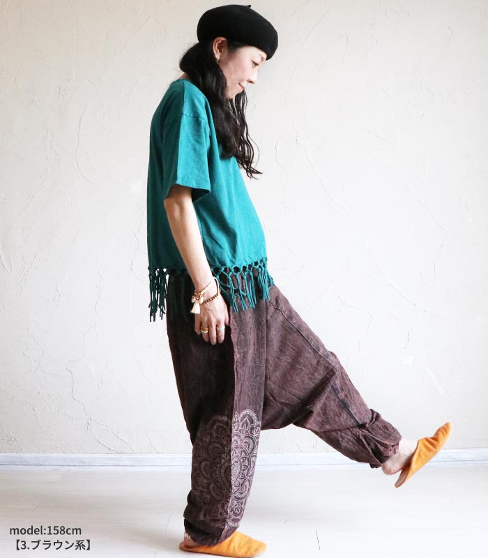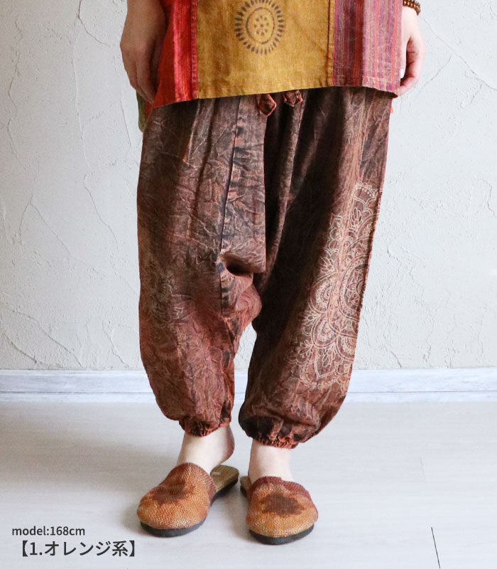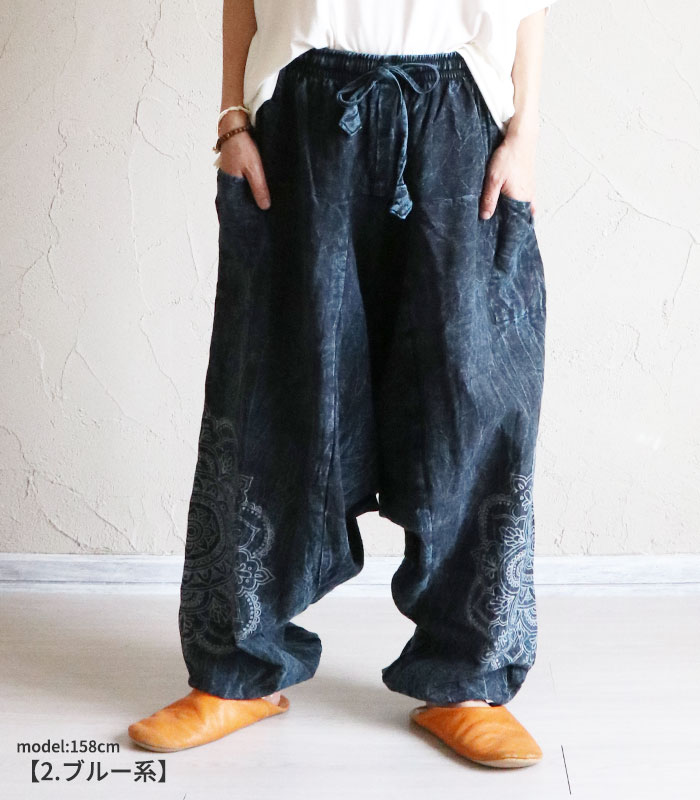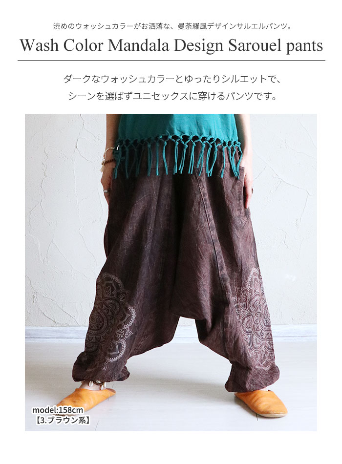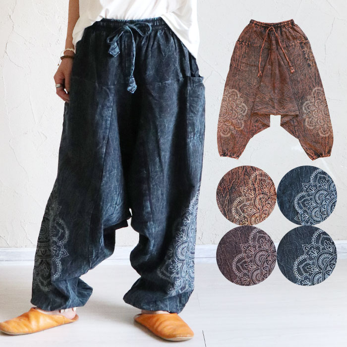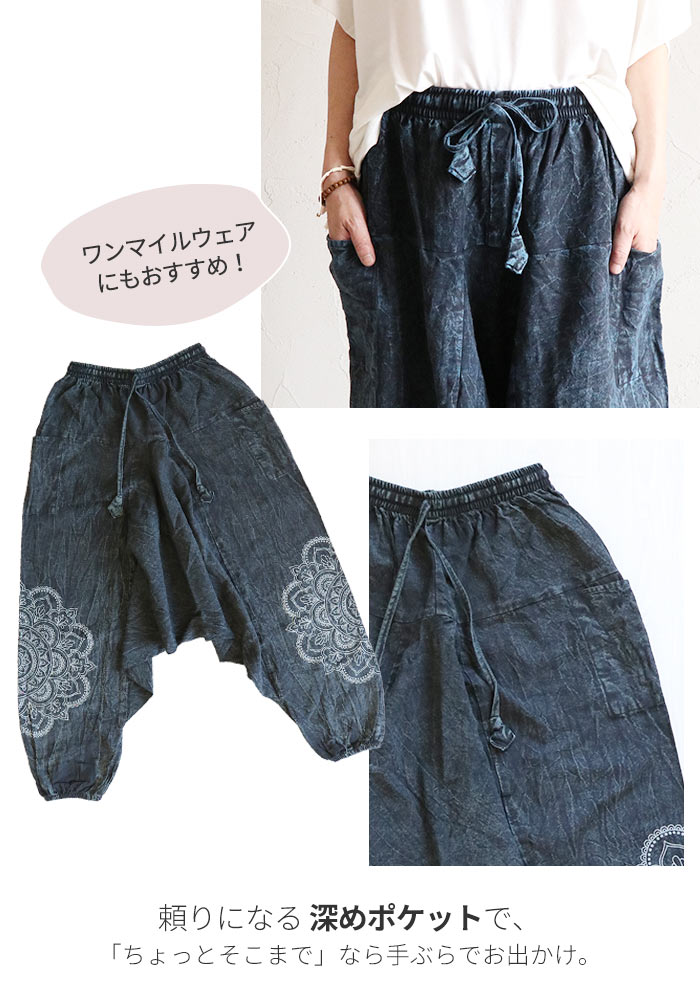 コメント: 渋めのウォッシュカラーがお洒落な、曼荼羅風デザインサルエルパンツ。生地にシルクスクリーンプリントを施しパンツの形に縫製、それからストーンウォッシュ加工と、デザイン・工程・仕上がりにこだわり制作されたパンツです。穿くだけでこなれ感の出るシルエットは、大人エスニックにピッタリのボトムス。ウエストにはゴム・ヒモ、裾にゴム入りで動きやすく、アクティブなシーンやリラックスタイムにもぴったりの穿き心地。ダークなウォッシュカラー、ゆったりとしたシルエットでユニセックスに着用して頂けます。